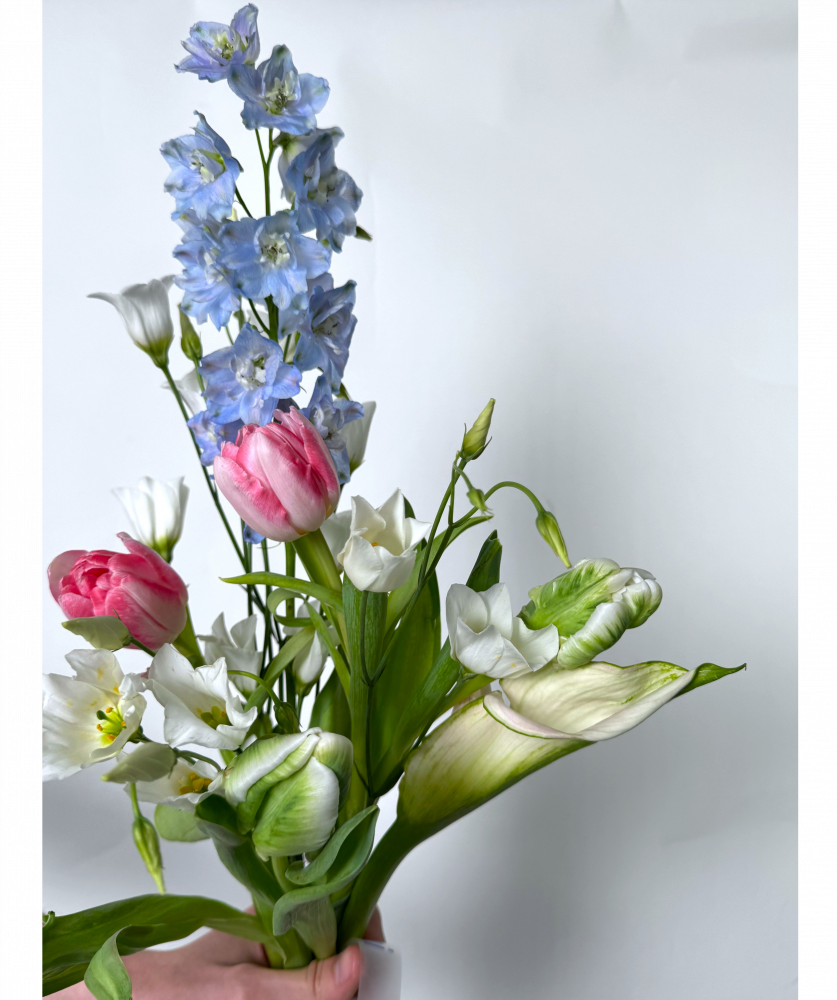 Состав букета: дельфиниум, тюлльпан, калла, лизиантус, тюльпан па супер пэррот.