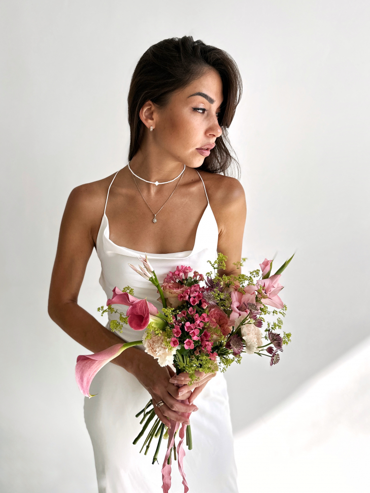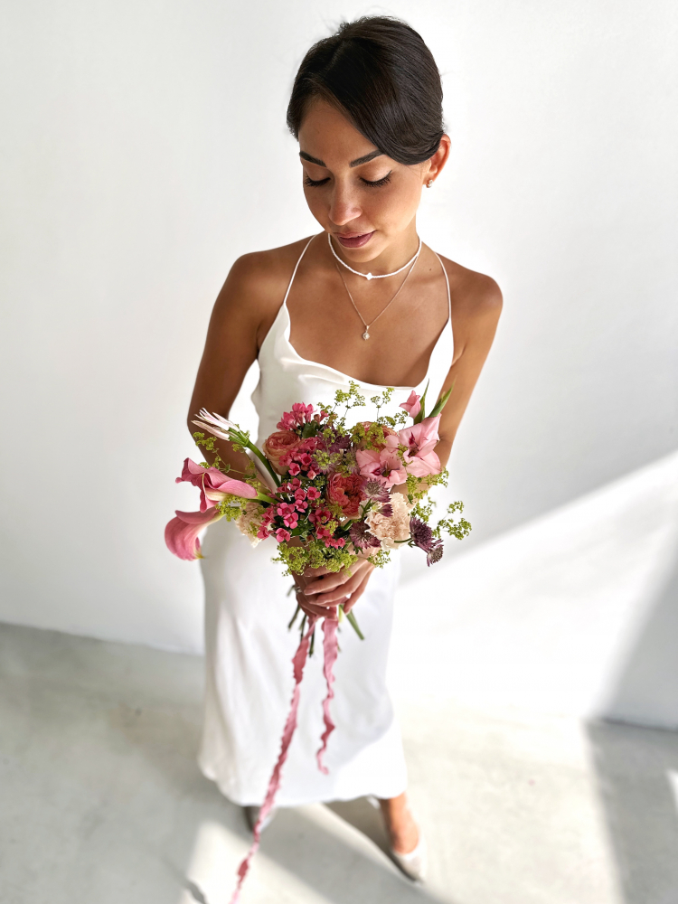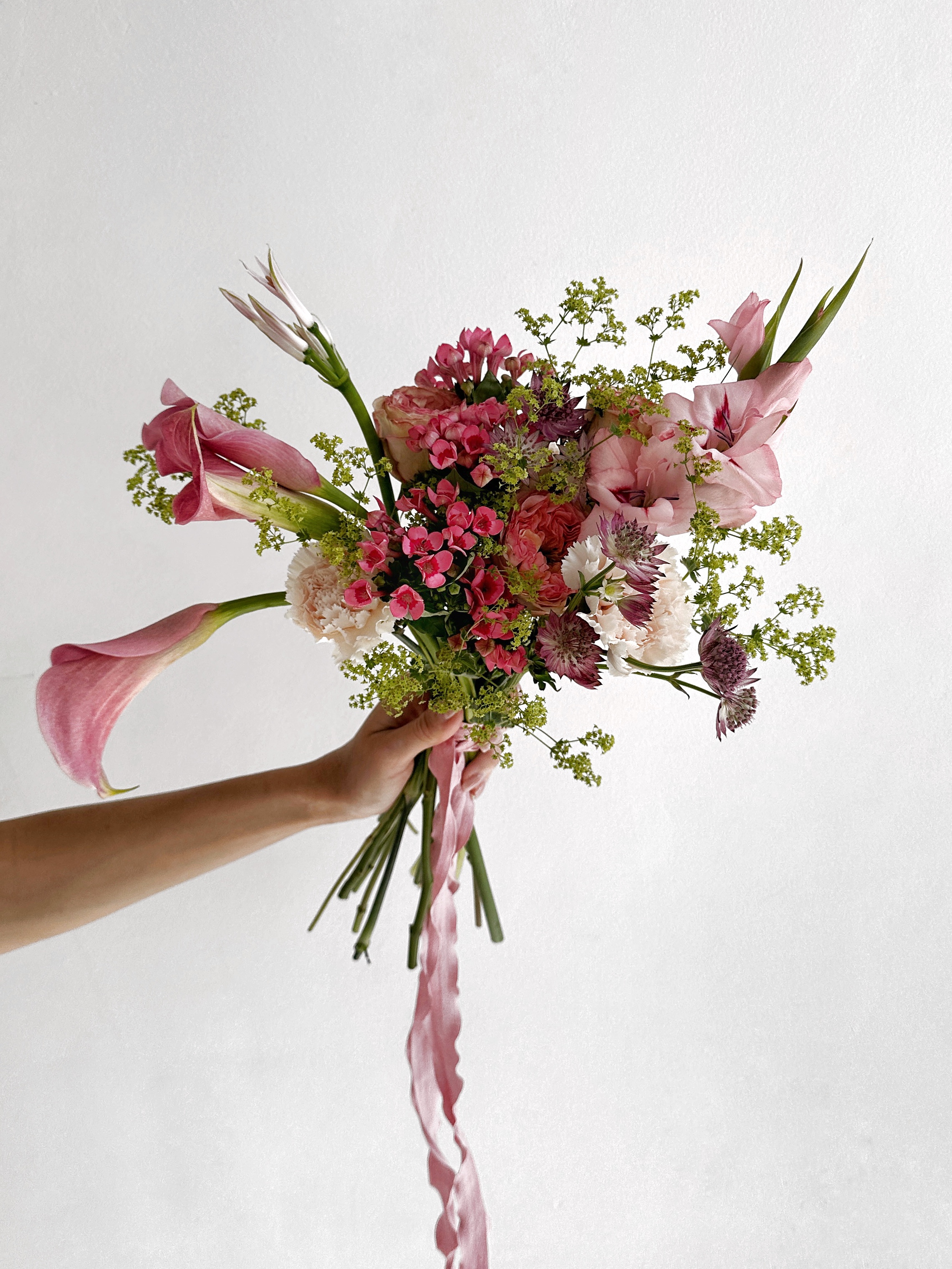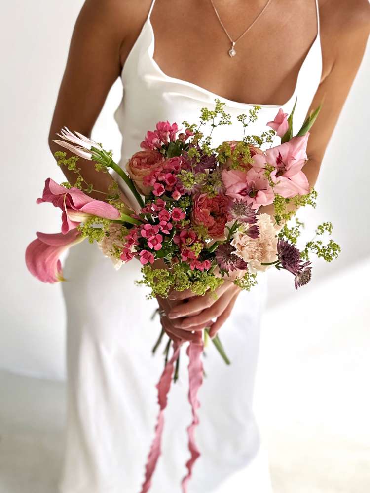 Состав букета на фото: Калла кендифлосс, Гладиолус, Бовардия эн маджестик, Роза Шарминг Корнейл, Диантус / гвоздика, Астранция рим, Альхемилла моллис робустика, Нерине боудени фаворит. Состав букета может меняться в зависимости от сезонности цветов.