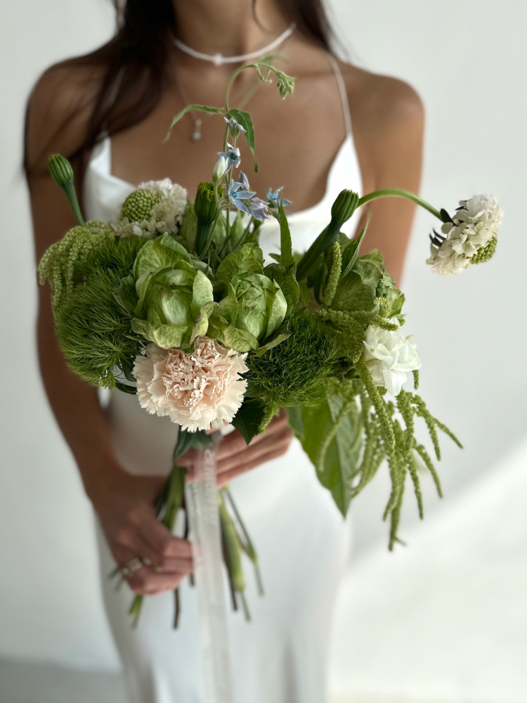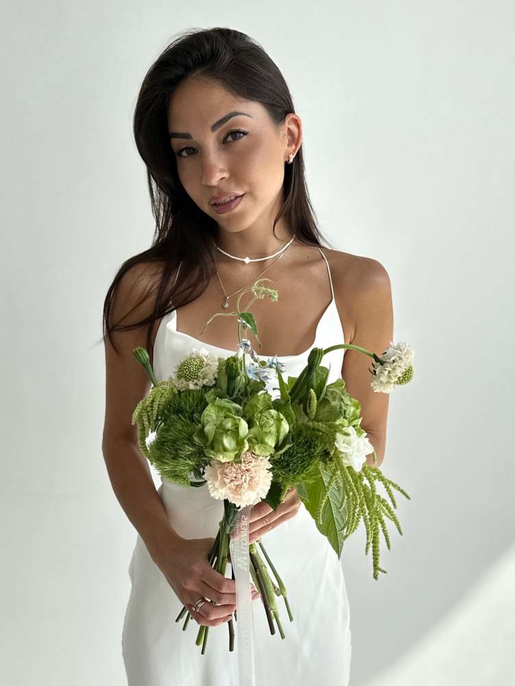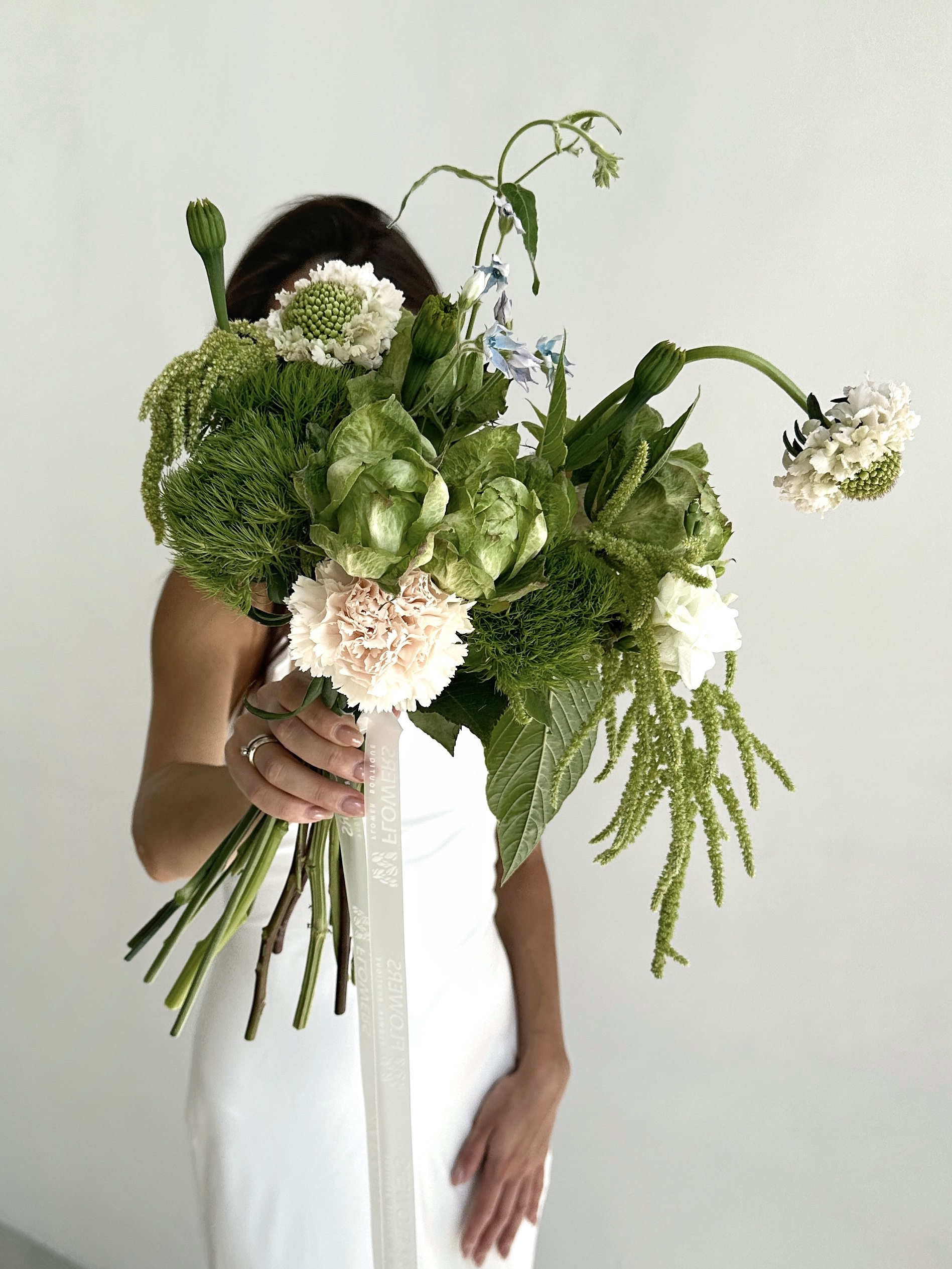 Букет невесты с розой вегги, гвоздикой грин болл и амарантусом