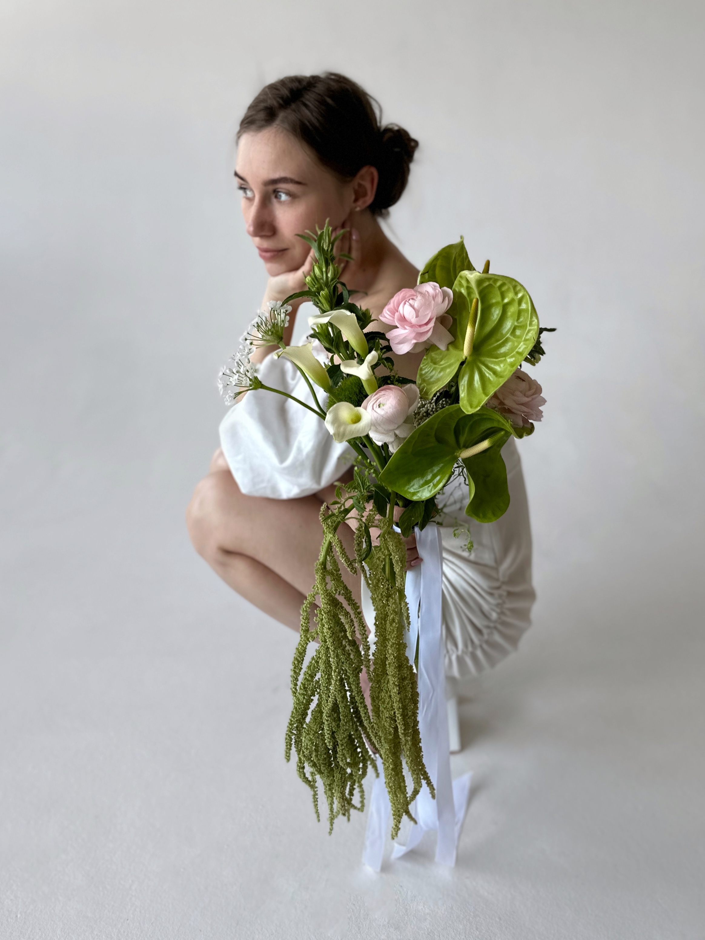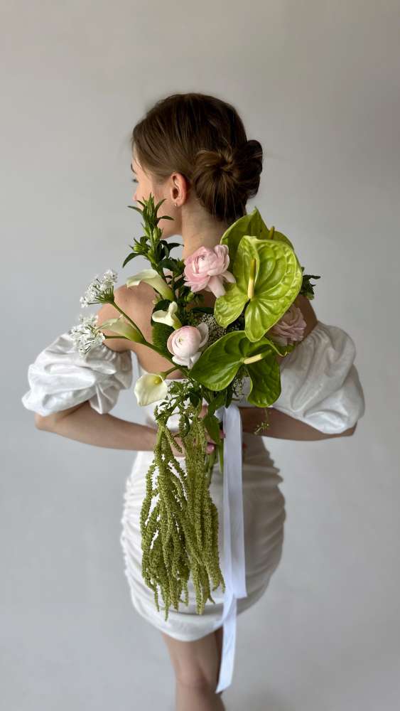 Состав букета на фото: Антуриум зеленый, Гвоздика барбатус, Ранункулус маршмеллоу, Аллиум флокон, Кампанула белая, Амаратнус зеленый, Тиласпия грин