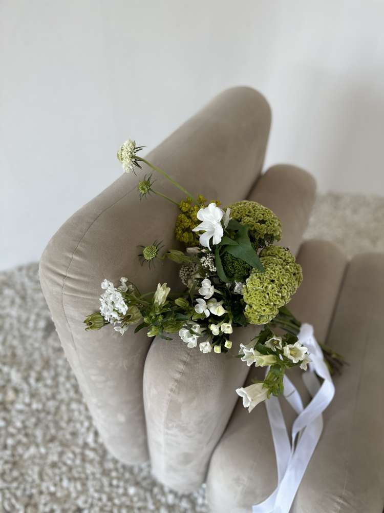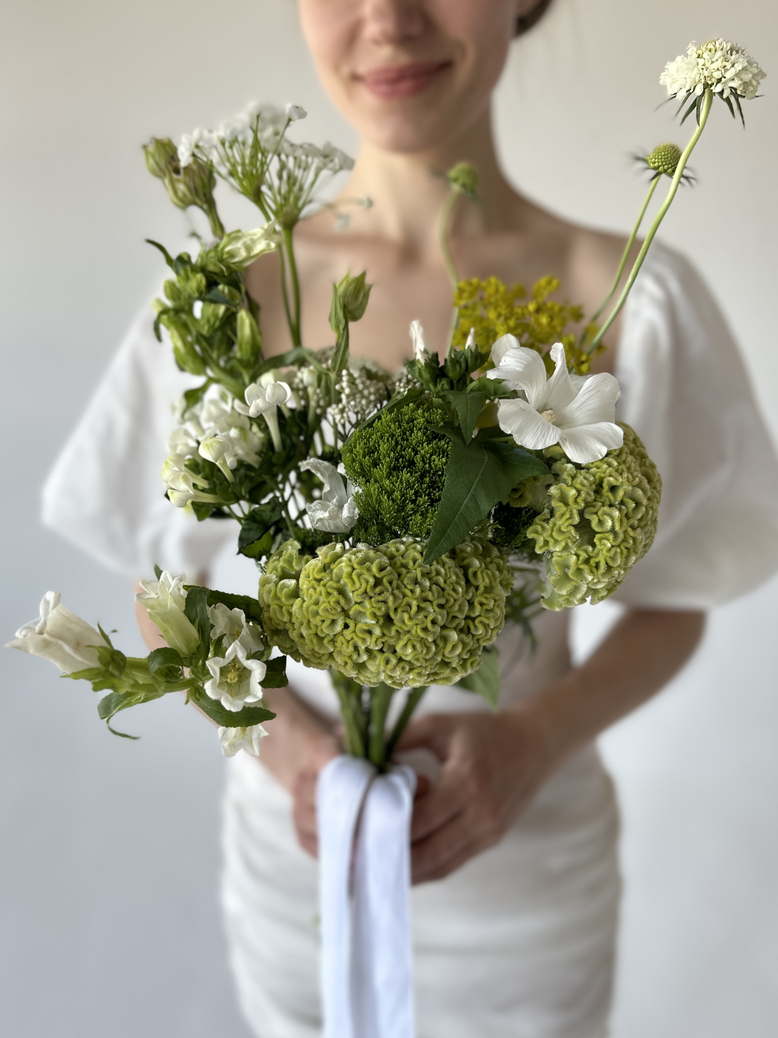 Состав букета на фото: Целозия, Лаватера, Кампанула, Аллиум флокон, Скабиоза, Смолёвка луговая, Молочай полевой желтый, Трахелиум зеленый, Озотамнус вайт