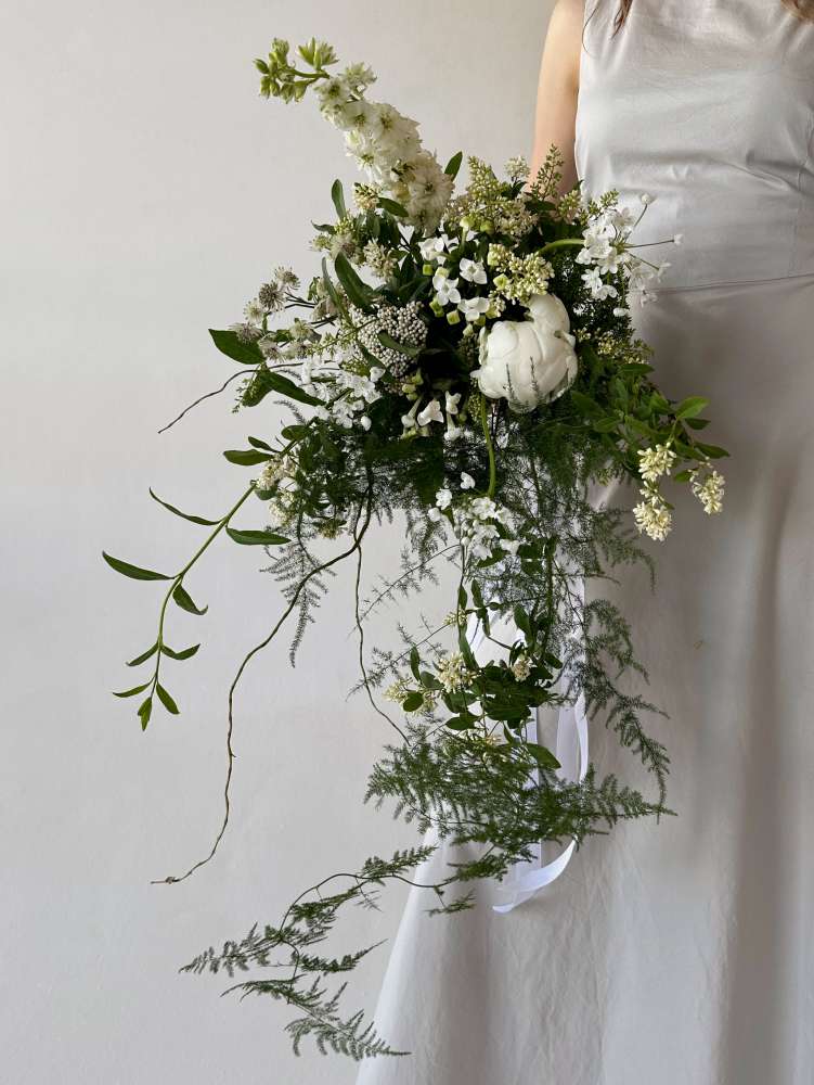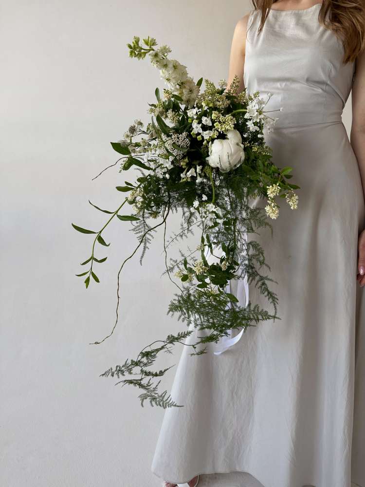 Состав букета на фото: Пион Мадам Клауд Тейн, Астранция миллиард старс, Бовардия вайт, Озотамнус вайт, Аллиум флокон, Лигуструм белый, Ракита, Трахелиум Зеленый, Консолида кис вайт, Аспарагус плюмозус