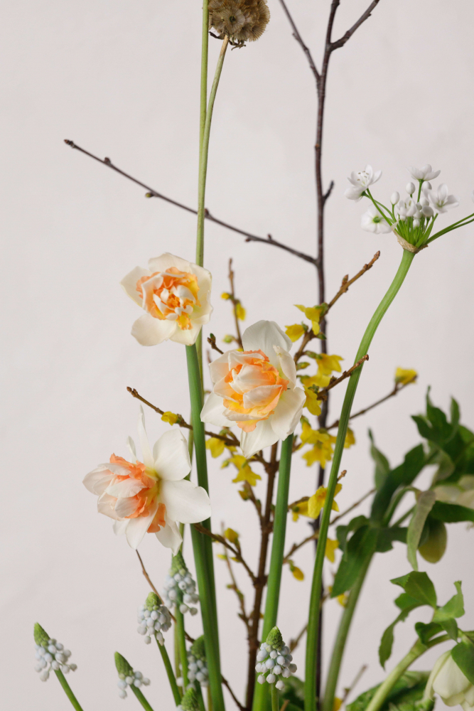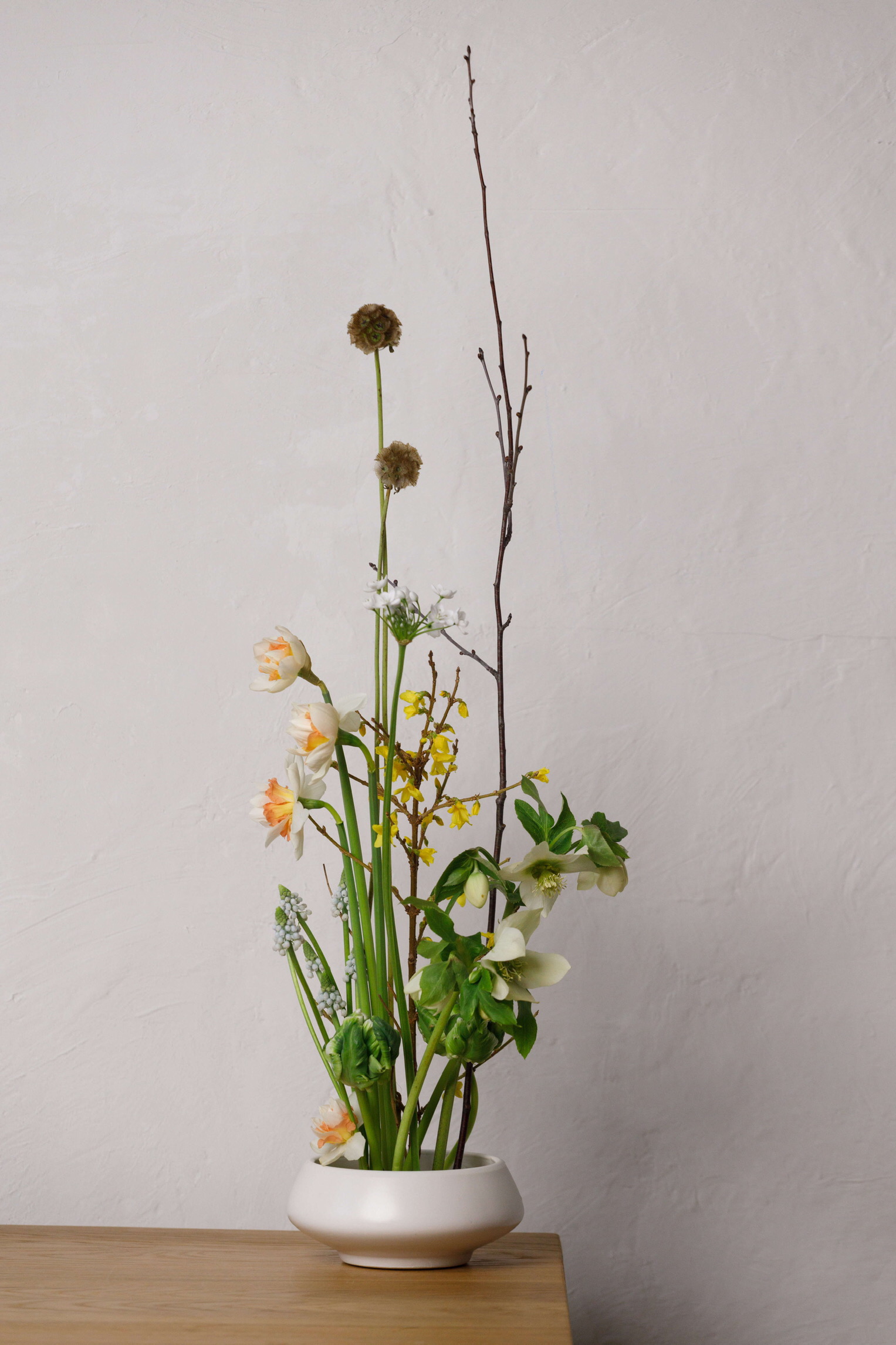 Композиция на кензане из нарциссов, форзиции и хелеборуса
