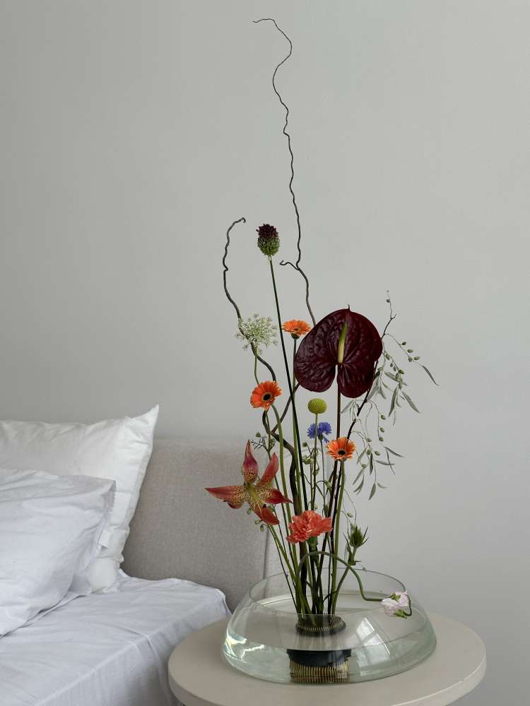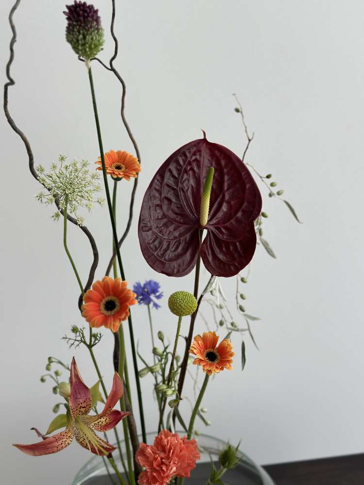 Состав композиции на фото: Антуриум Тропик Найт (бордо), Лилия фьюжн, Минигербера пикколини, Гвоздика, Краспедия селект тинтед лайм, Ракита, Аллиум сфероцефалон, Амми полевой, Латирус, Василек, Маслина дикая с плодами, Ваза Емма 34х9,5 и кензан
