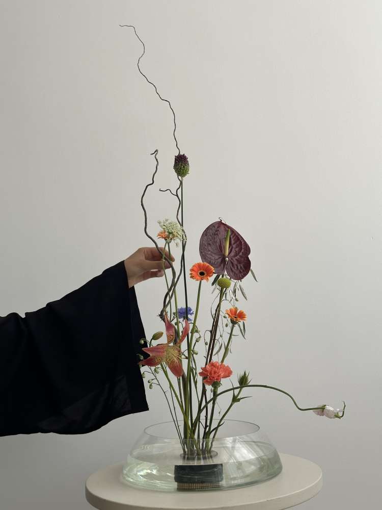 Композиция на кензане с антуриумом и ракитой. Кензан был представлен широкой публике в конце 19 века в Японии как стремление адаптировать искусство экибаны для европейской культуры. Сегодня кензан широко используют в интерьерной флористике