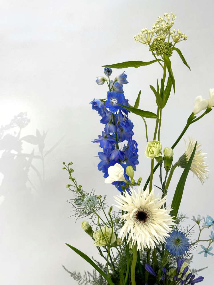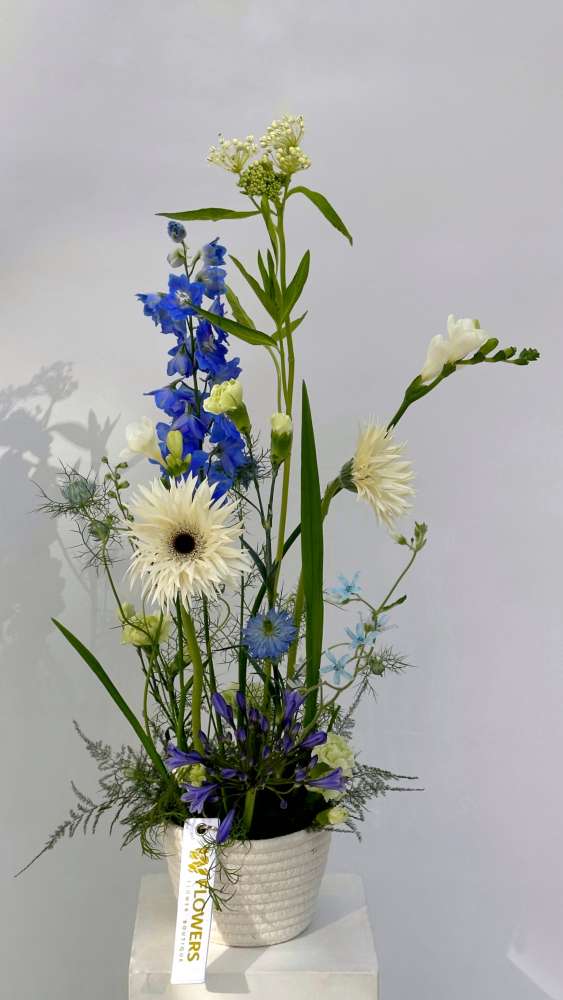 Состав композиции на фото: Джутовая корзина, Аспарагус плюмозус, Оксипеталум хевенборн, Агапантус сьюзан, Диантус кустовой / гвоздика, Гербера гарден, Дельфиниум ду кендл, Нигелла скай, Фрезия Асклепиас айс баллет. Состав композиции может меняться в зависимости от сезонности цветов.