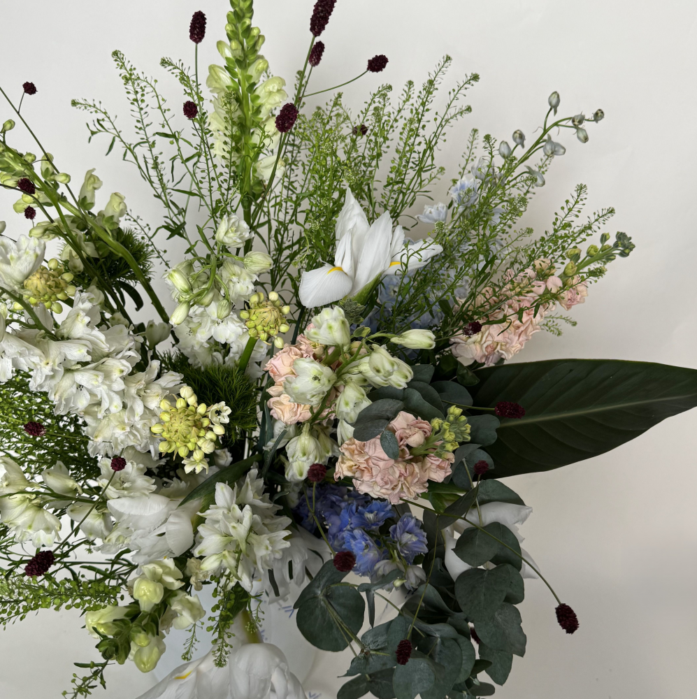Состав букета: ирисы, дельфиниум, маттиола, эвкалипт., теласпия.