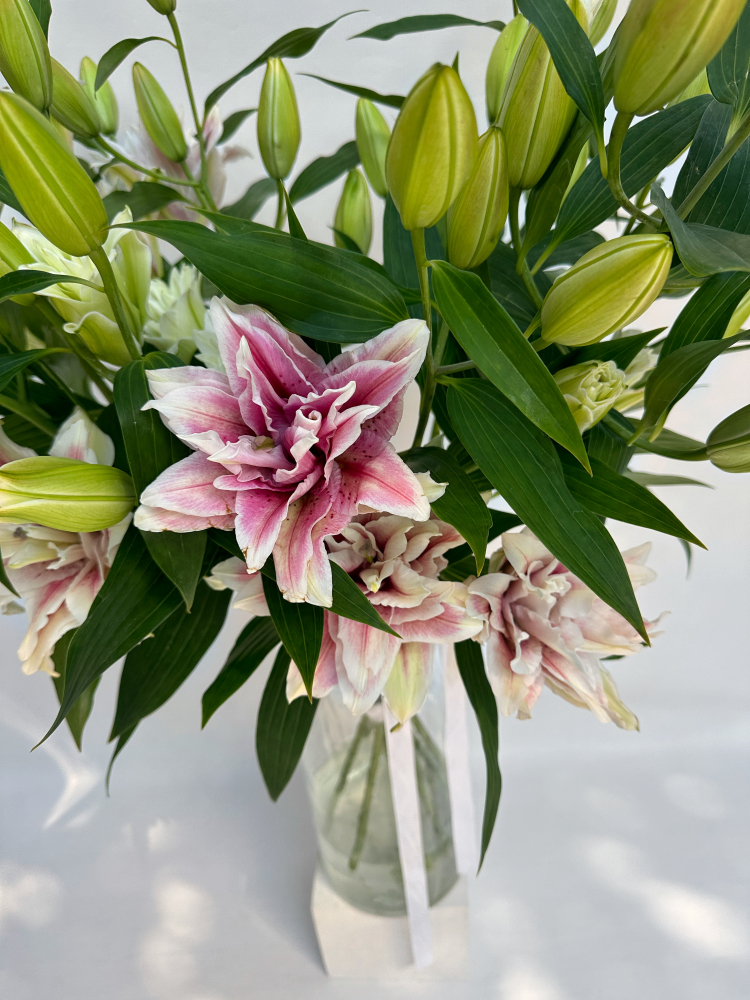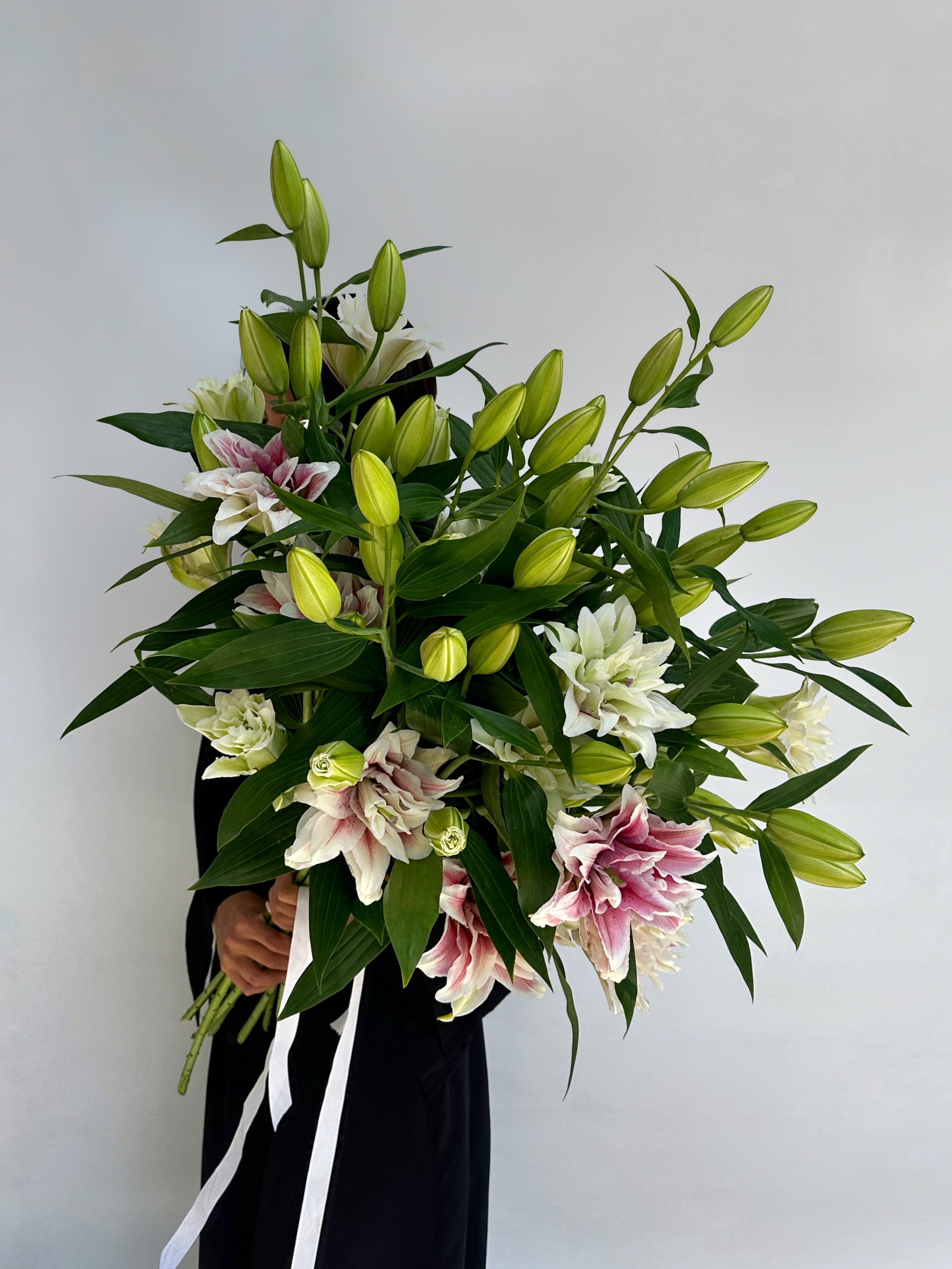 Букет из 10 махровых лилий фэнтези. Высота букета - 100 см, диаметр букета - 70 см.