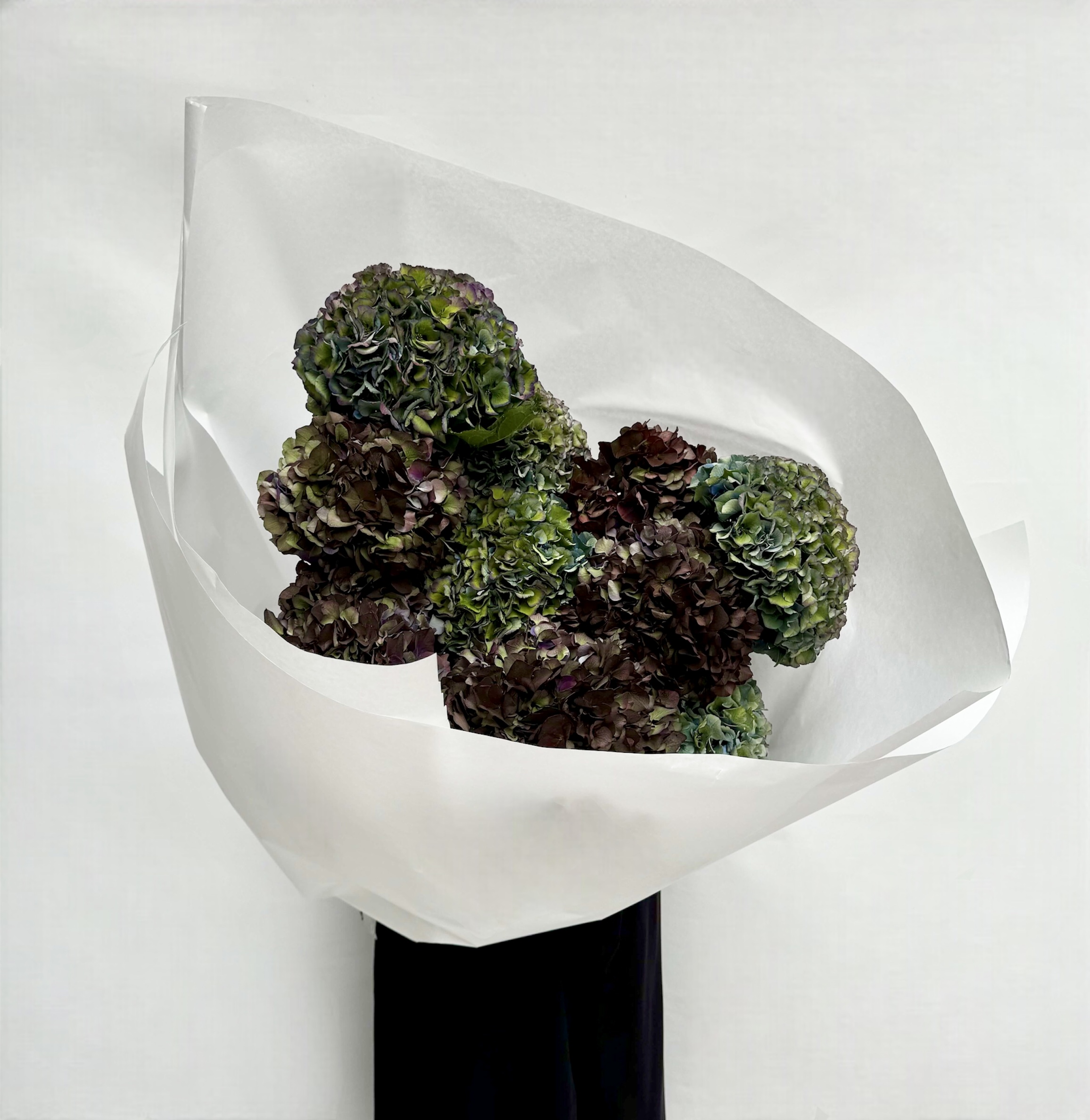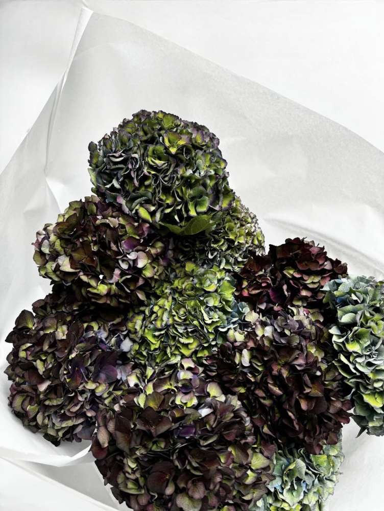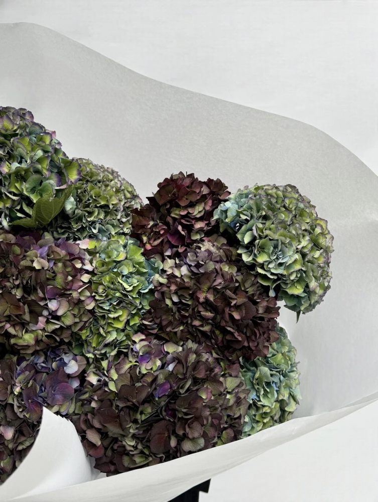 Состав букета на фото: гортензия меджикал дарк руби и роял парад классик