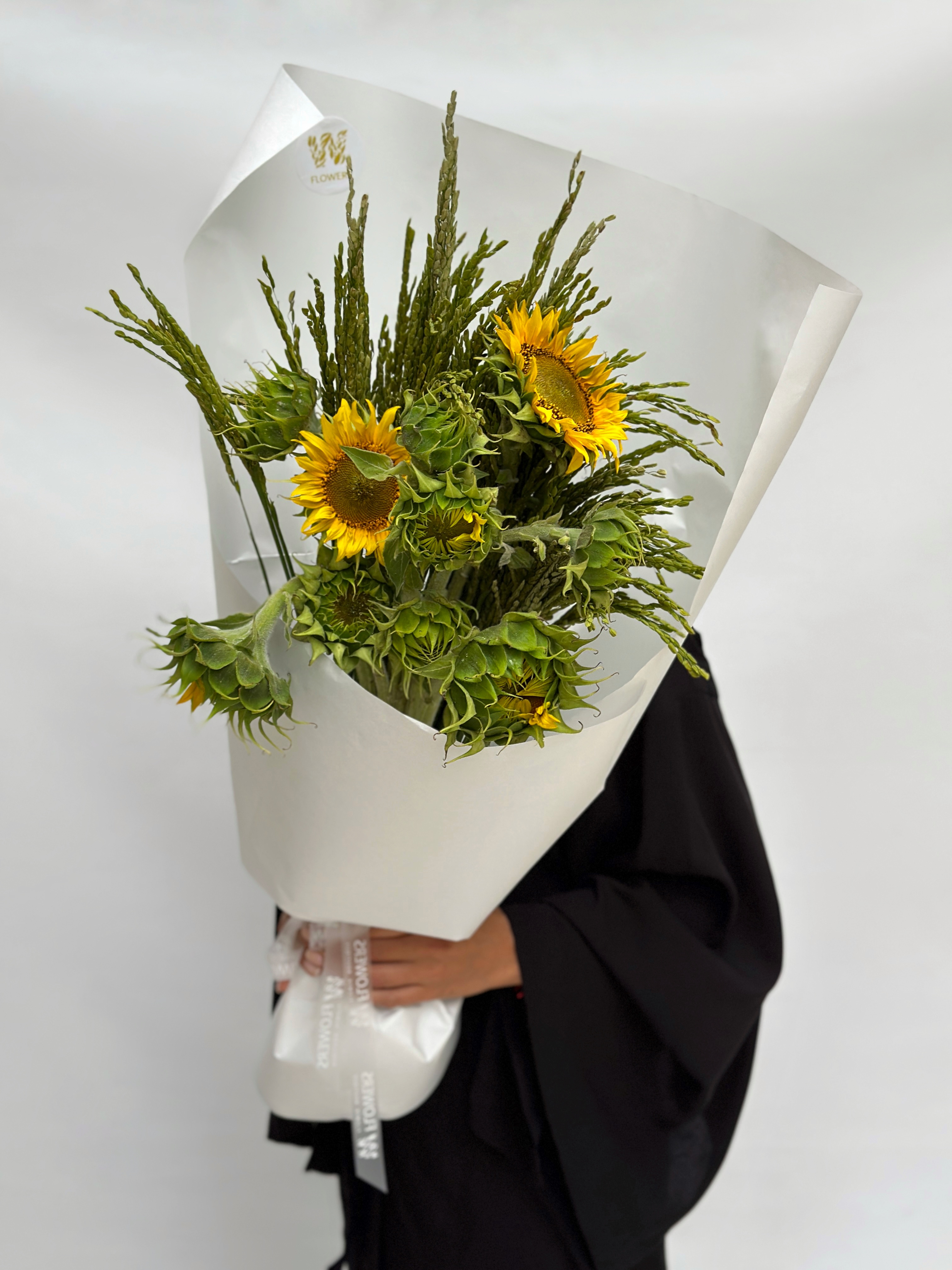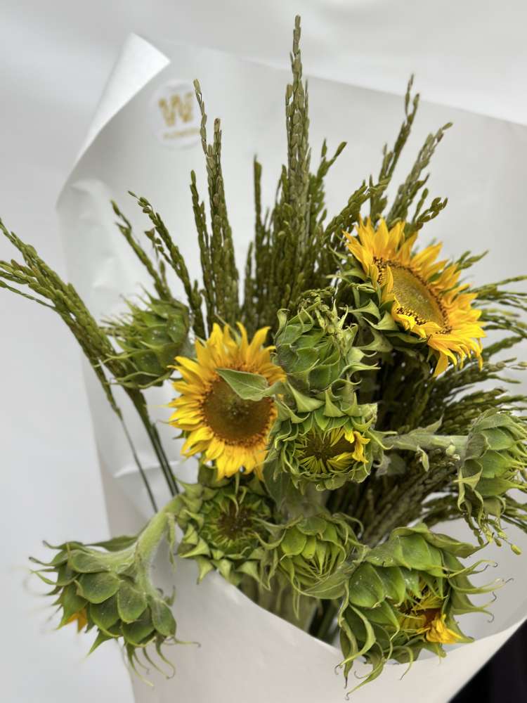 Букет из подсолнухов и колосьев риса - прекрасный подарок для особенных людей, которым вы хотите передать свою заботу и нежные чувства. Этот букет подарит радость и улыбку, добавит нежности в жизнь и станет прекрасным дополнением к любому интерьеру.