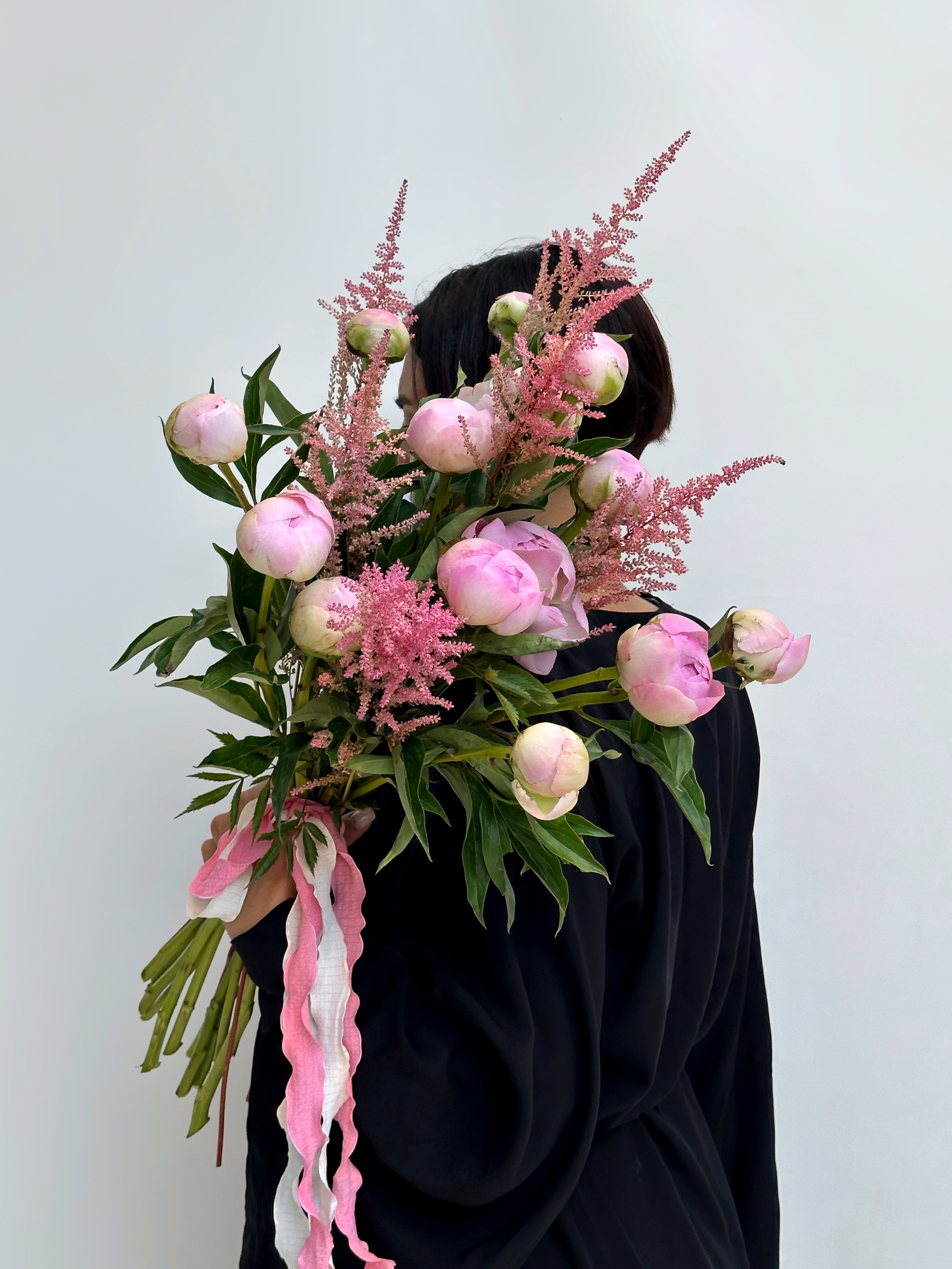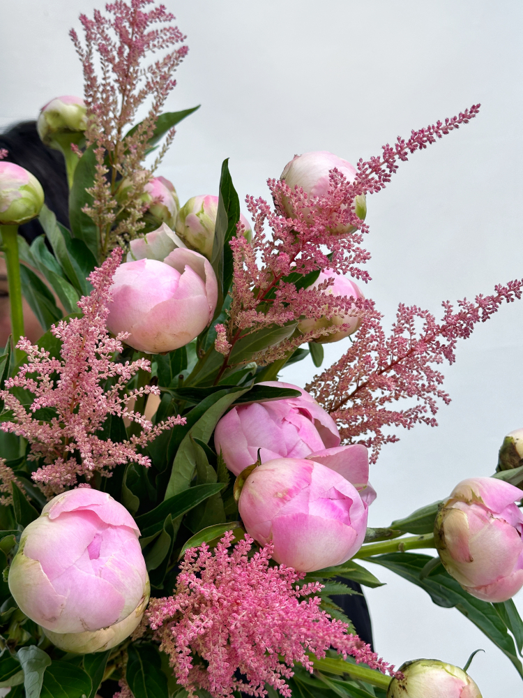 Букет с пионами и астильбой - это изысканная картина нежности и элегантности. Окутывает своими ароматами и захватывает взгляды яркостью своих цветов. Идеально подойдет для романтического свидания или в подарок на день рождения, а также станет прекрасным украшением интерьера.