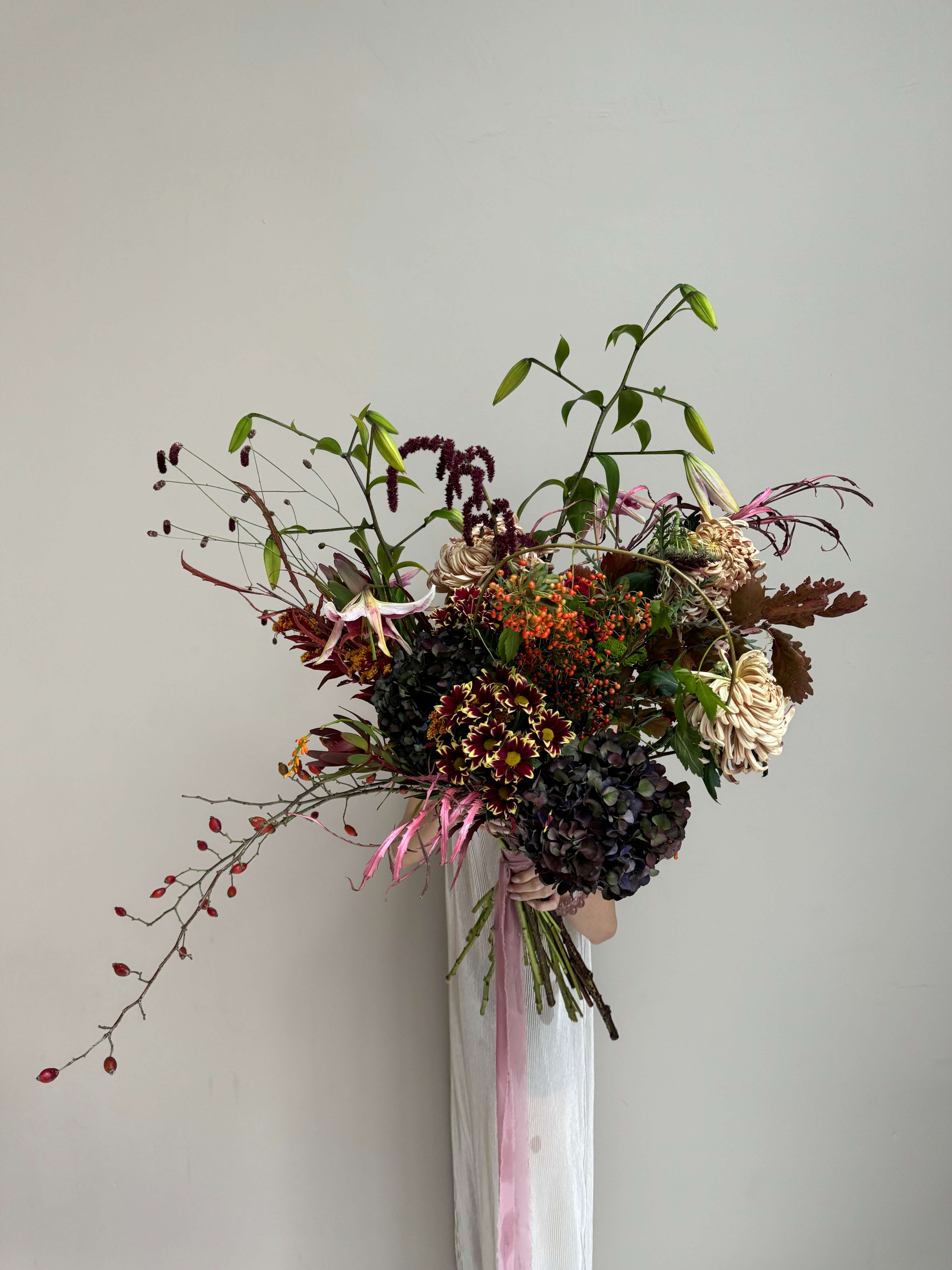 Большой букет из сезонных осенних цветов в винно-кремовой цветовой гамме.