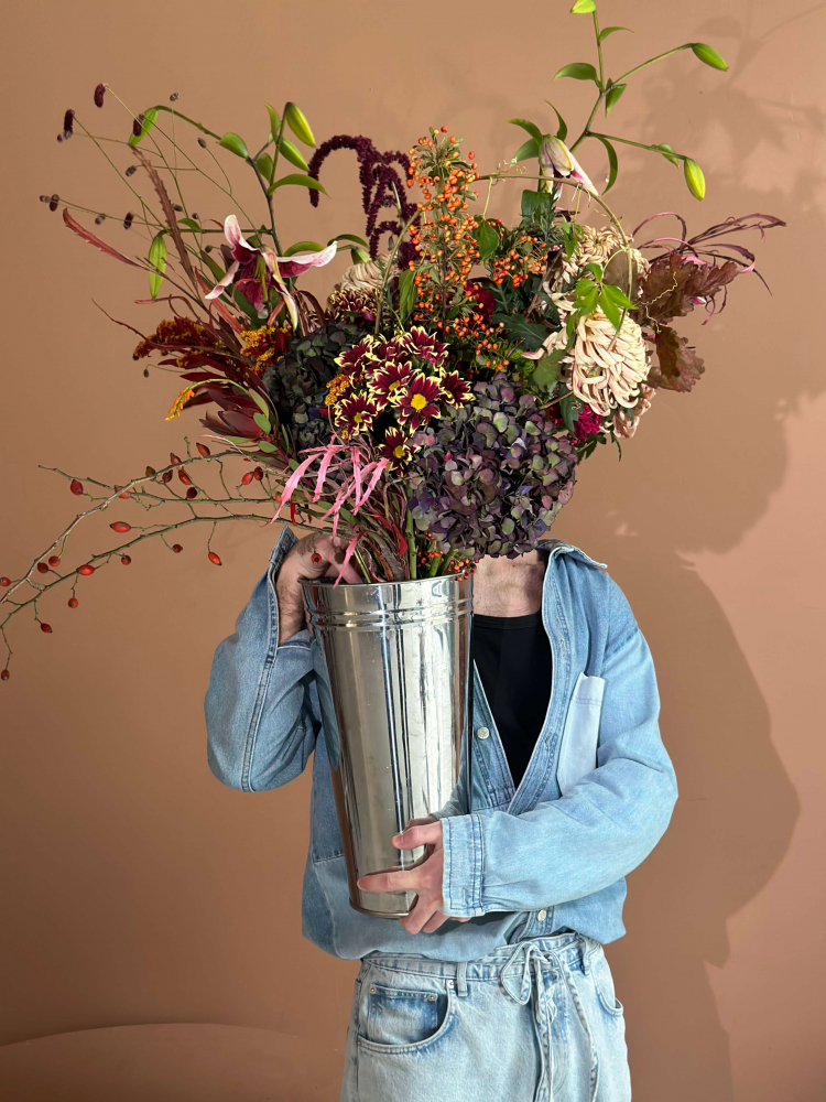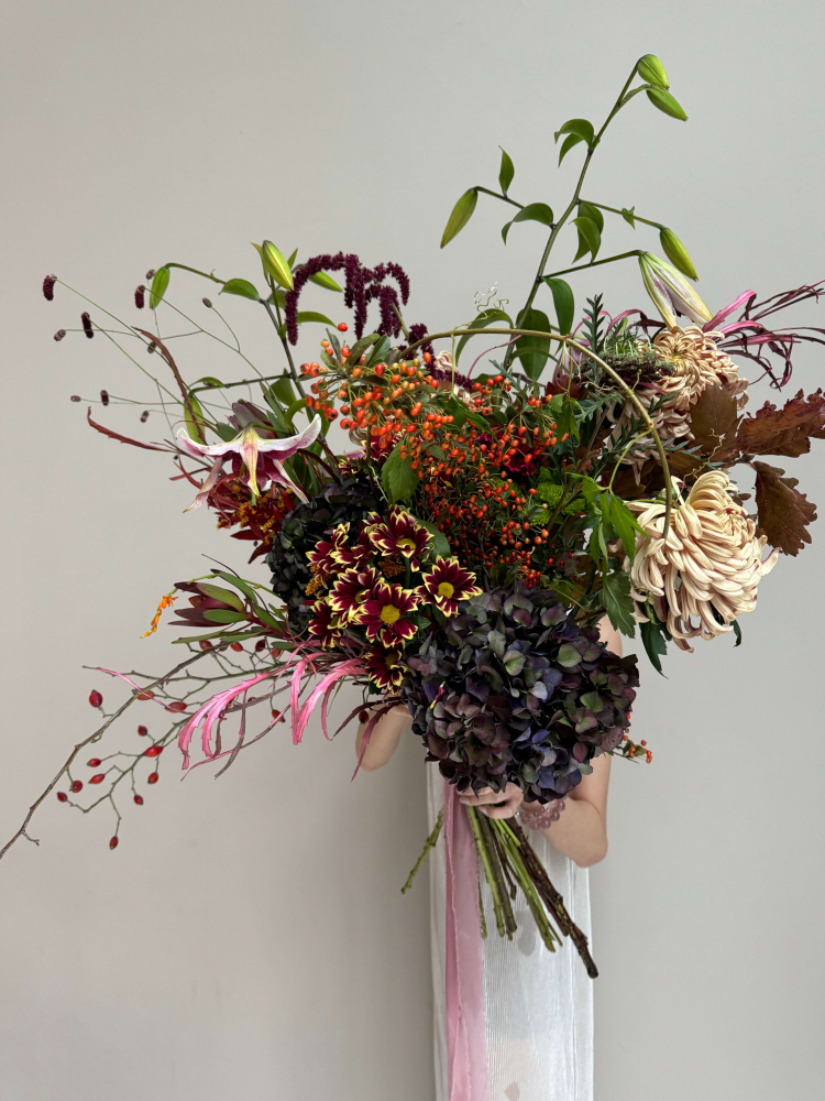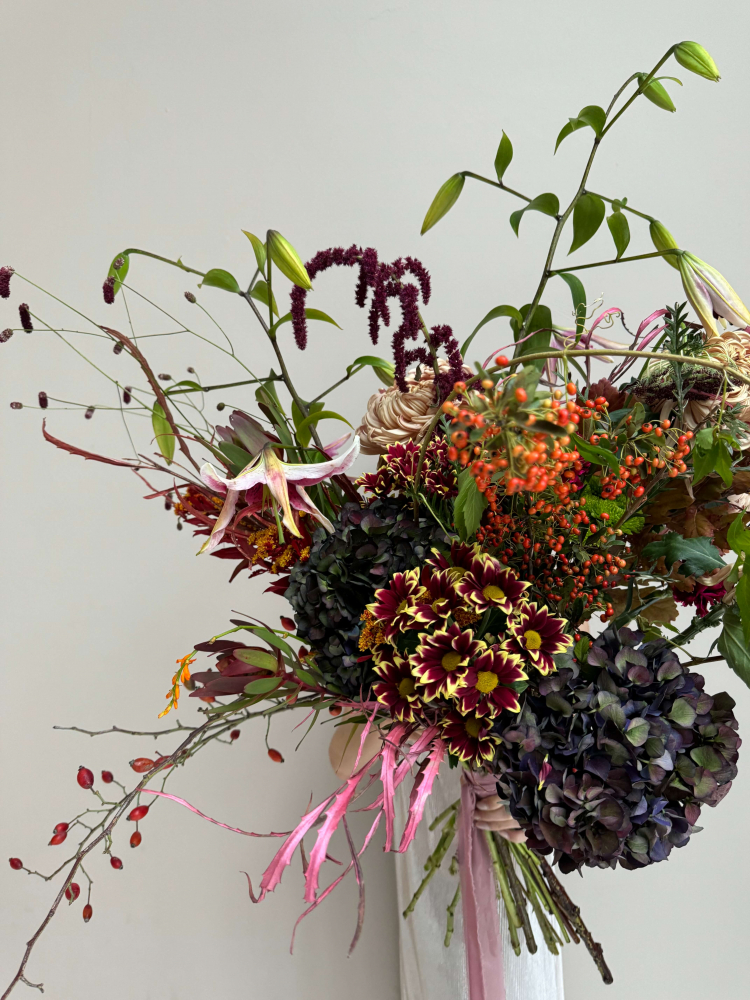 В букете на фото: хризантемы Виенна, гортензия, лилия, амарант, гривиллея, шиповник, амми, солидаго, леукодендрон, хризантема кустовая, листья дуба