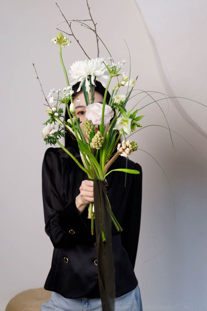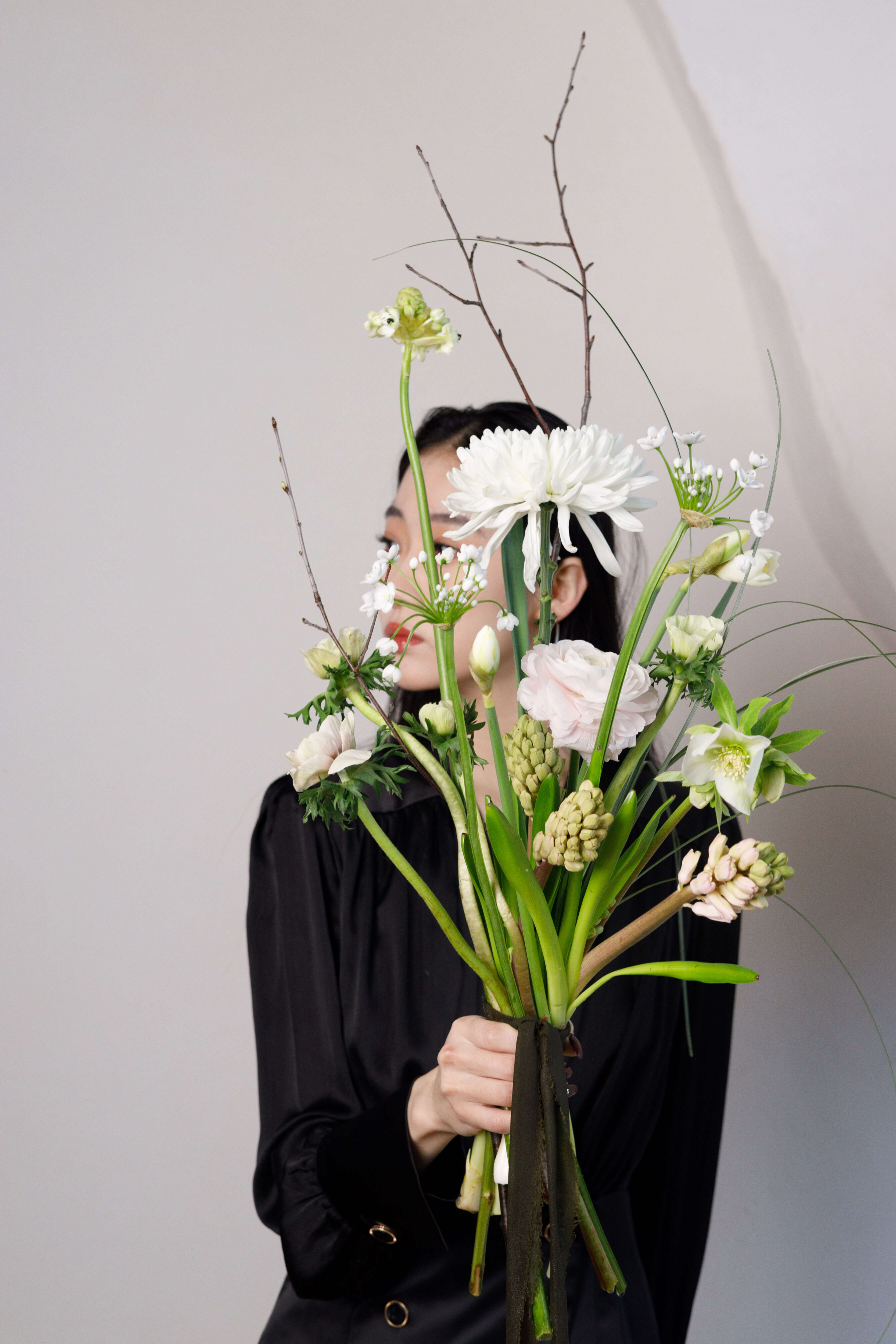 Состав букета на фото: гиацинты, ранункулюсы, нарциссы, анемоны, хелеборус, хризантемы, берграсс, ветки вишни, орнитогалум. Состав букета может меняться в зависимости от сезонности цветов.