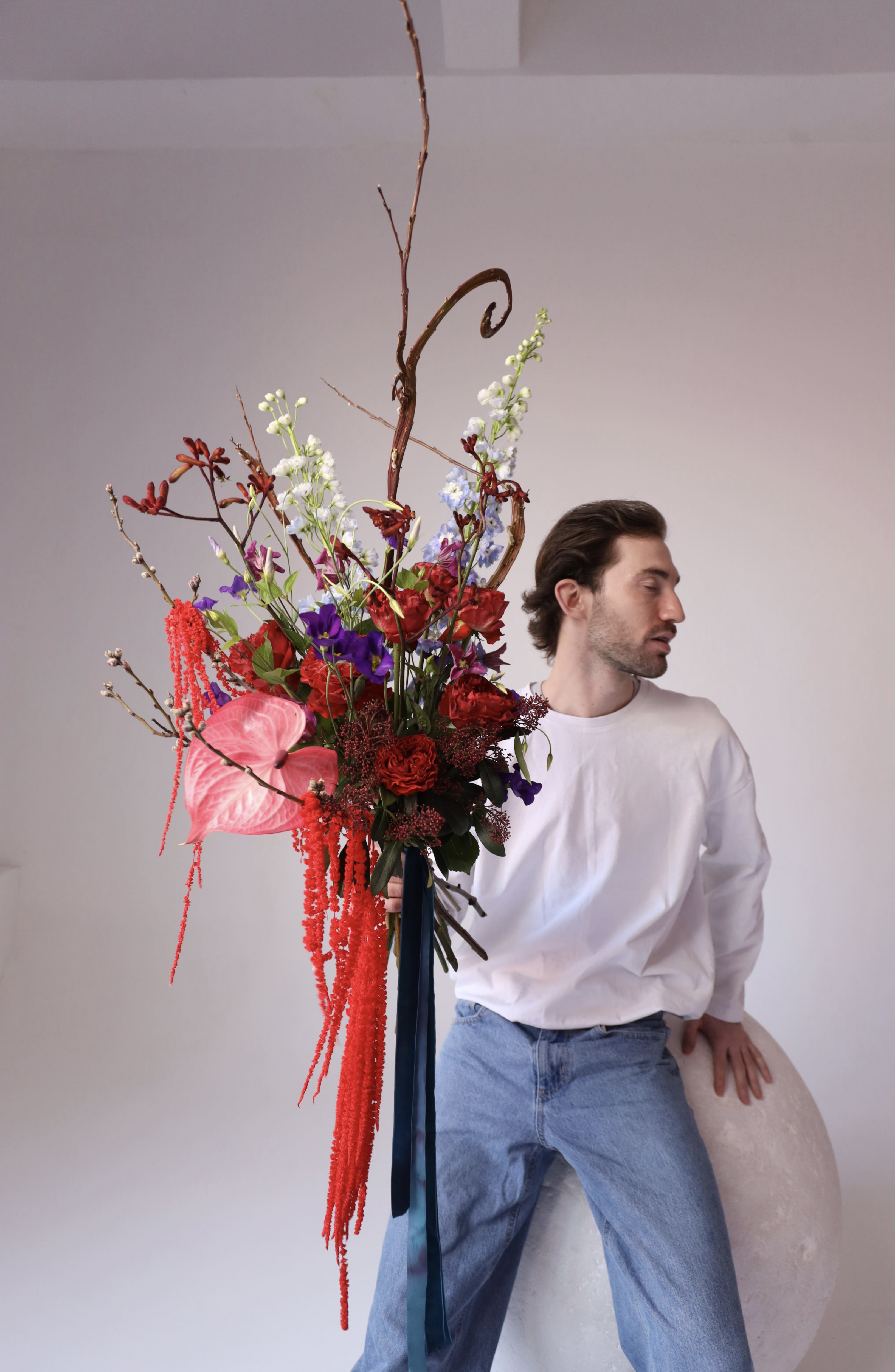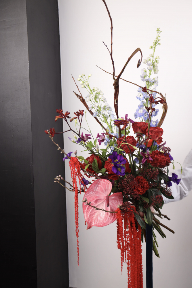 Состав букета на фото: красная роза ред монстр, лизиантус эн ботаник, саликс, дельфиниум, антуриум, анигозантус, скиммия, ветки вишни. Состав букета может меняться в зависимости от сезонности цветов.