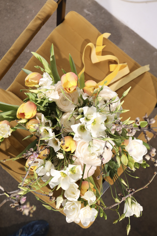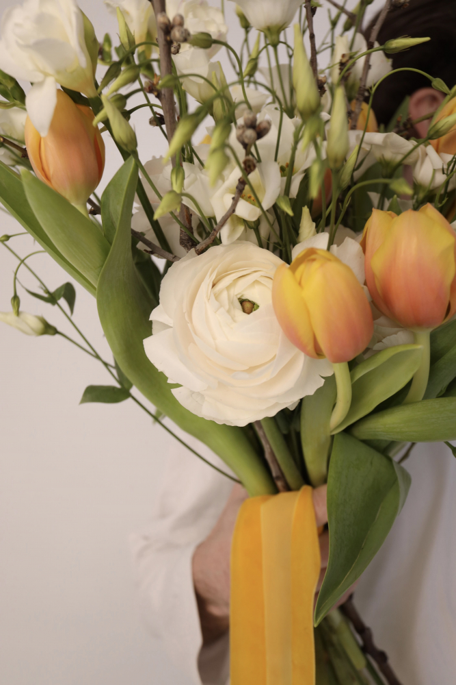Состав букета на фото: ранункулюс, тюльпаны, лизиантус эн ботаник, фрезия, ветки вишни. Состав букета может меняться в зависимости от сезонности цветов.