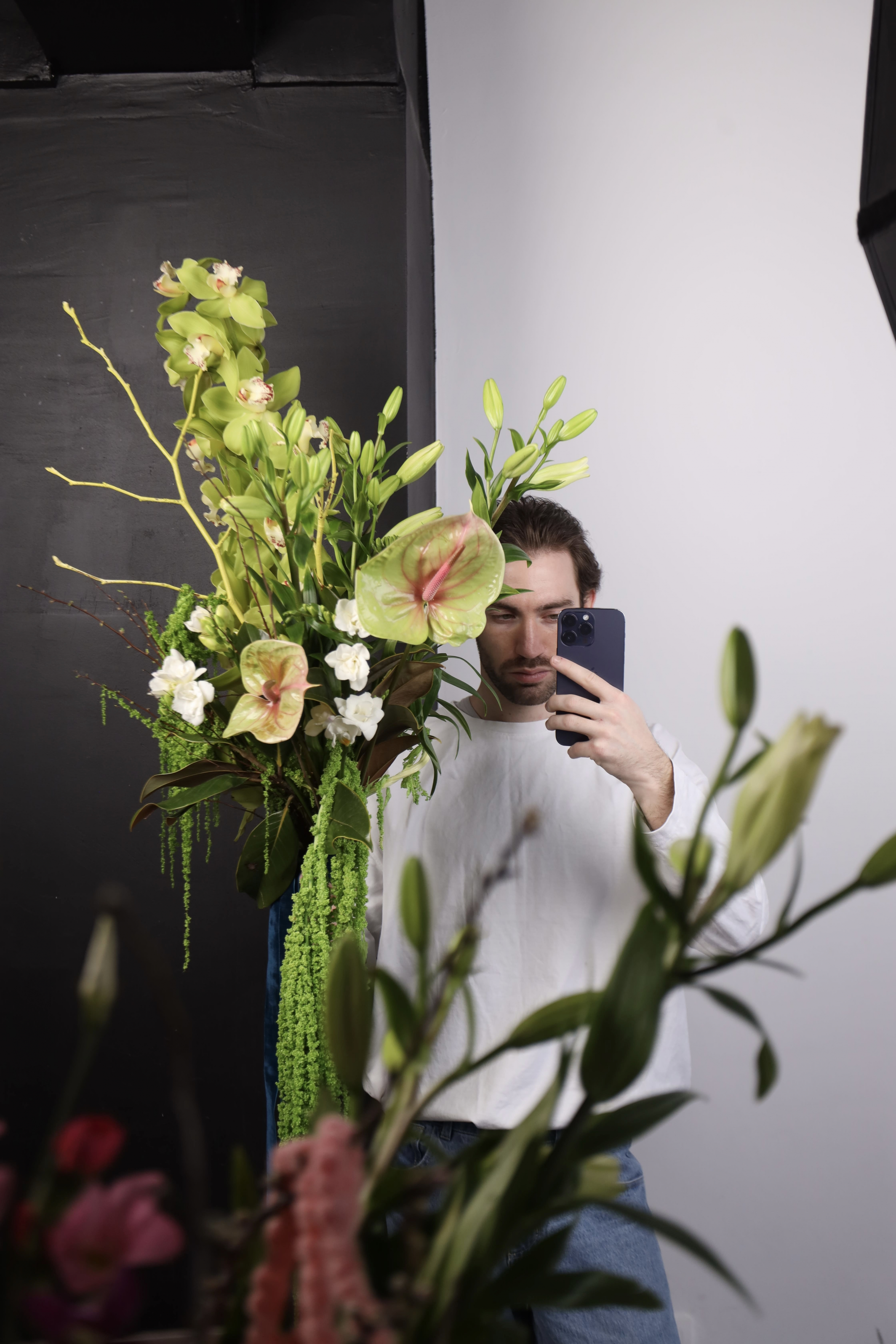 Свежий зеленый букет из цимбидиума, лилии и антуриума