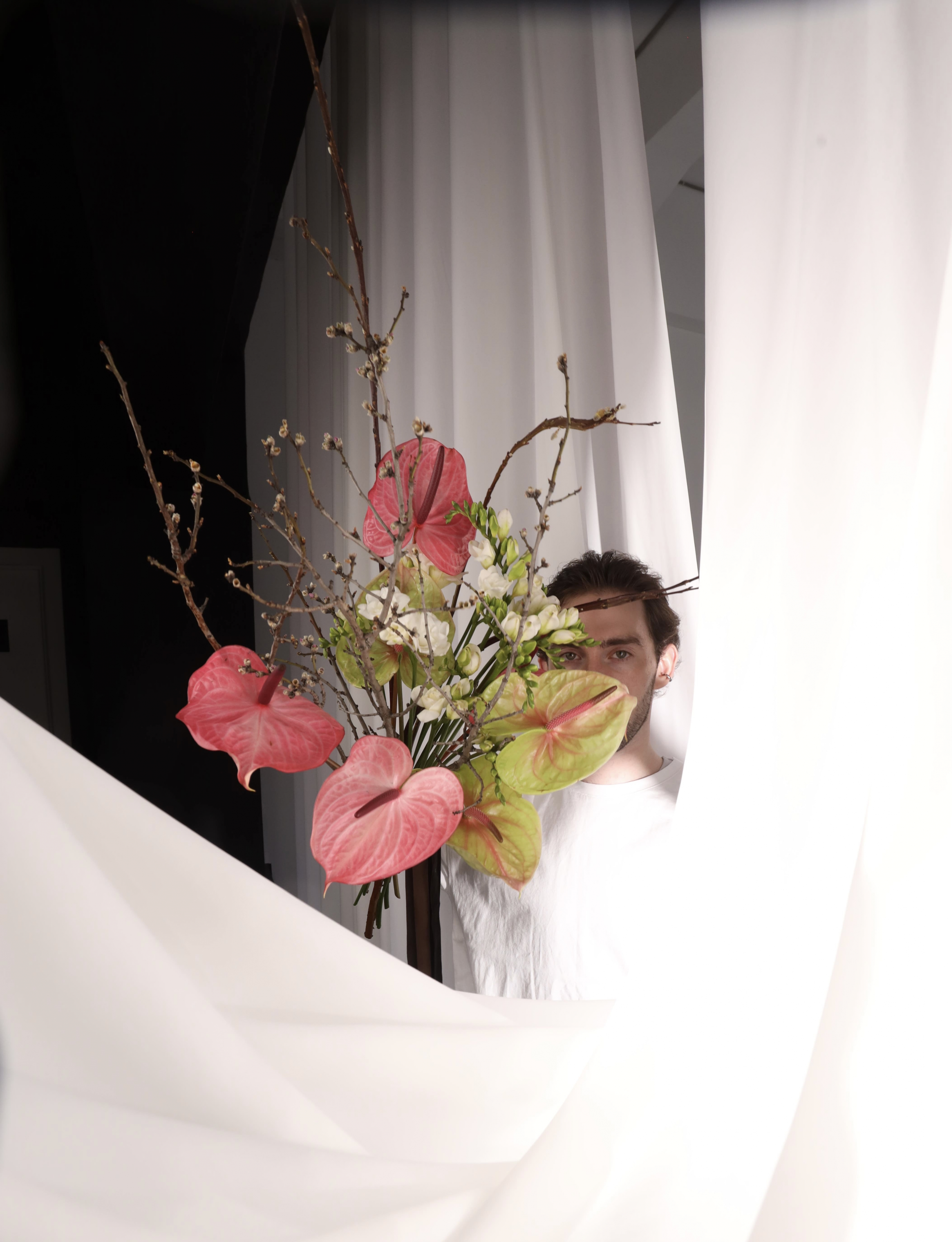Состав букета на фото: антуриум микс, фрезия, саликс секка, ветки вишни. Состав букета может меняться в зависимости от сезонности цветов.