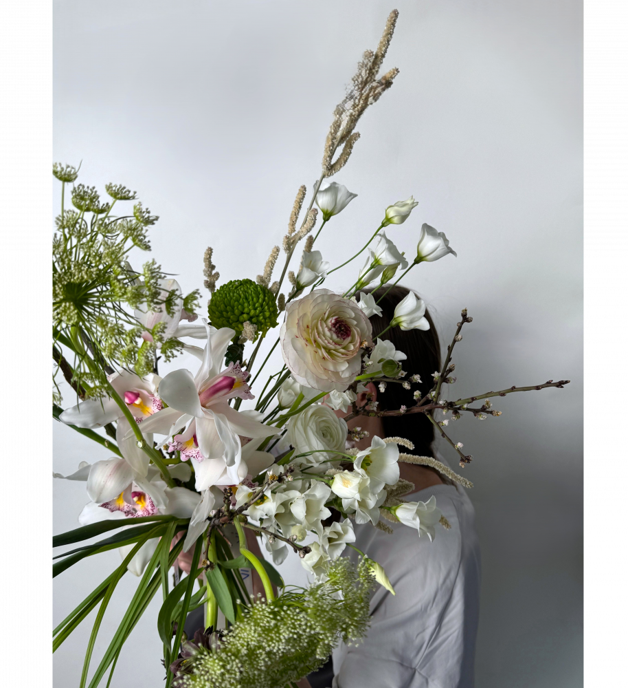Состав букета:фритиллярия, цимбидиум, хризантема алемани, листья берграсс, ветка алычи, амарантус ярминг, лизиантус эн ботаник, амми виснага, ранункулус элеганс вайт, ранункулус романс орлеан, ирис.