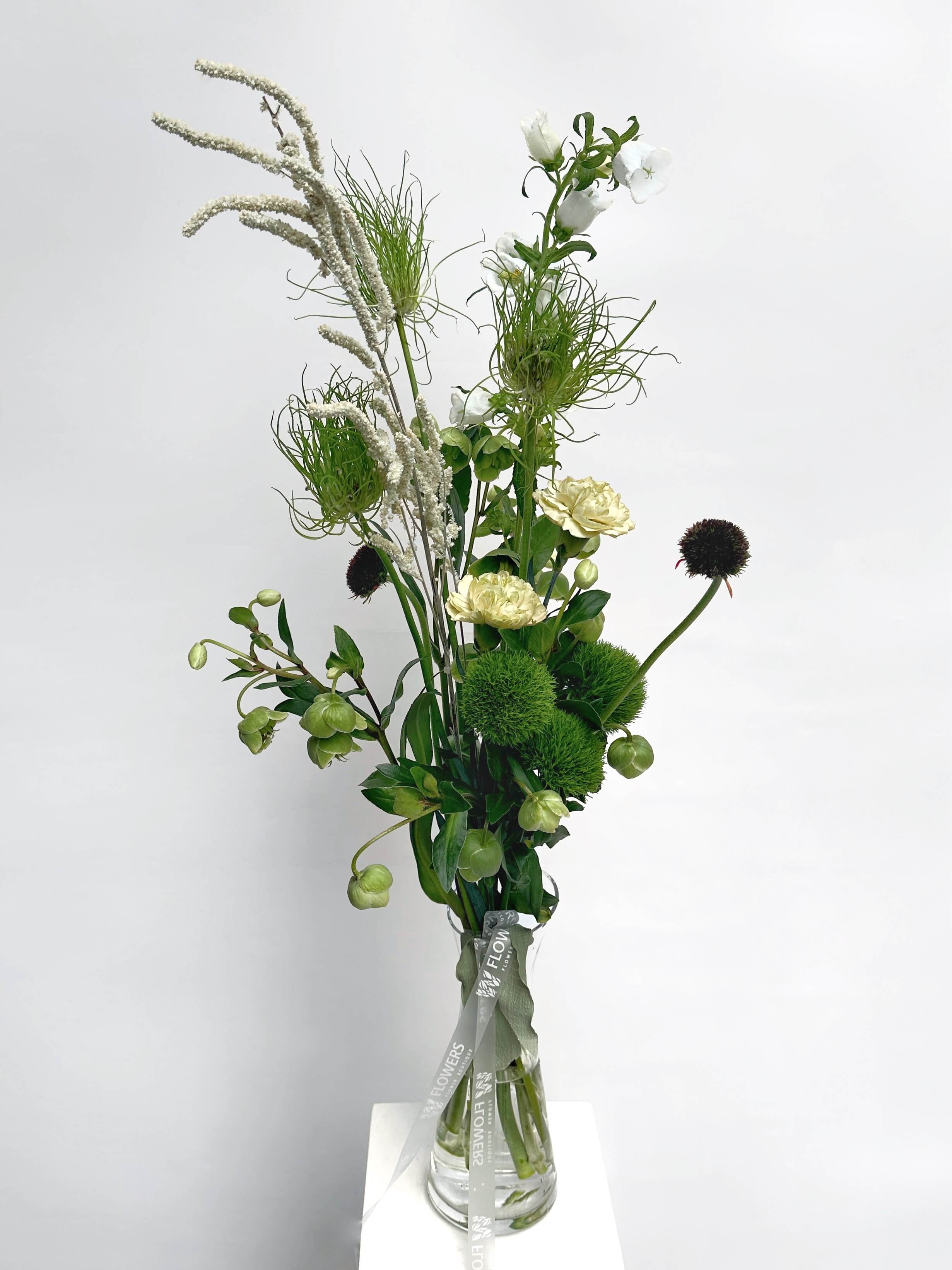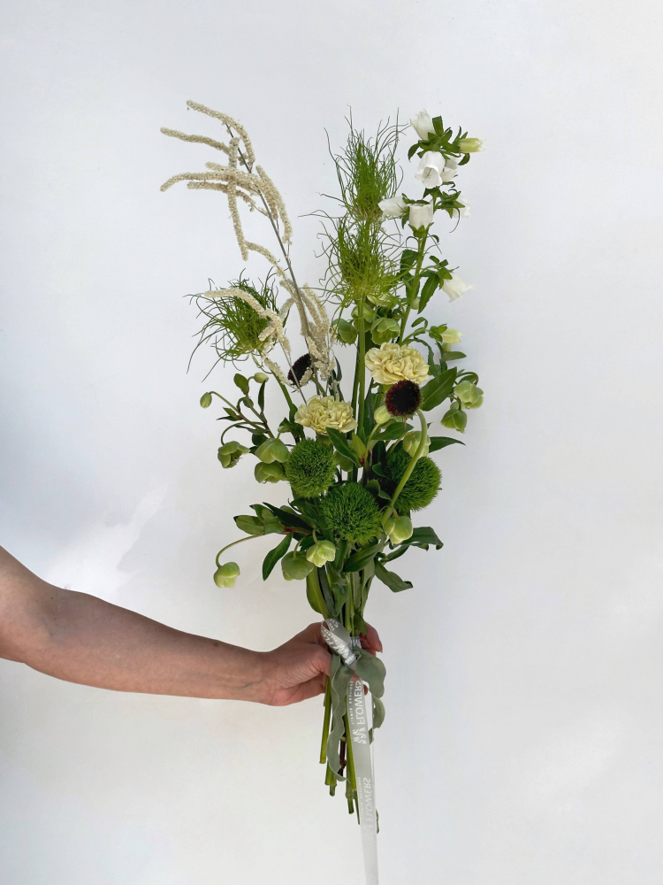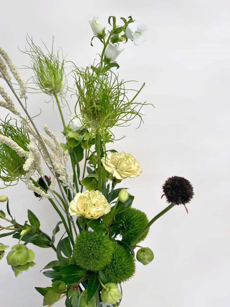 Состав букета на фото: Аллиум кетвизл, диантус барбатус Киви Меллоу / гвоздика, хелеборус магнификант, Амарантус ярминг десерт, Кампанула белая, диантус капучино / гвоздика . Состав букета может меняться в зависимости от сезонности цветов.
