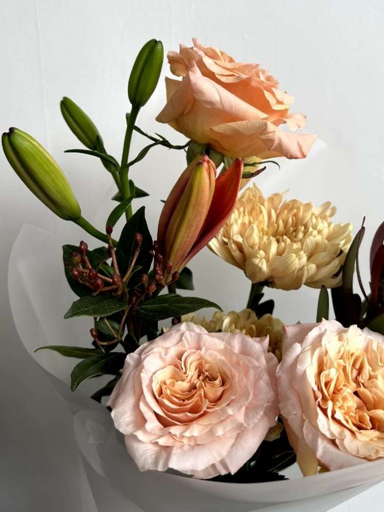 Букет из лилии, роз и хризантемы. Небольшой, но красивый букет отлично подойдет в качестве комплимента коллеге, учителю, а также поднимет настроение любимой девушке, маме или бабушке.