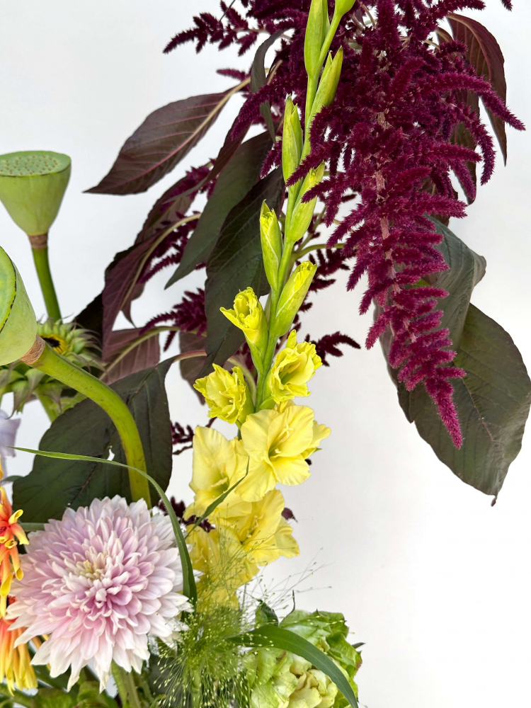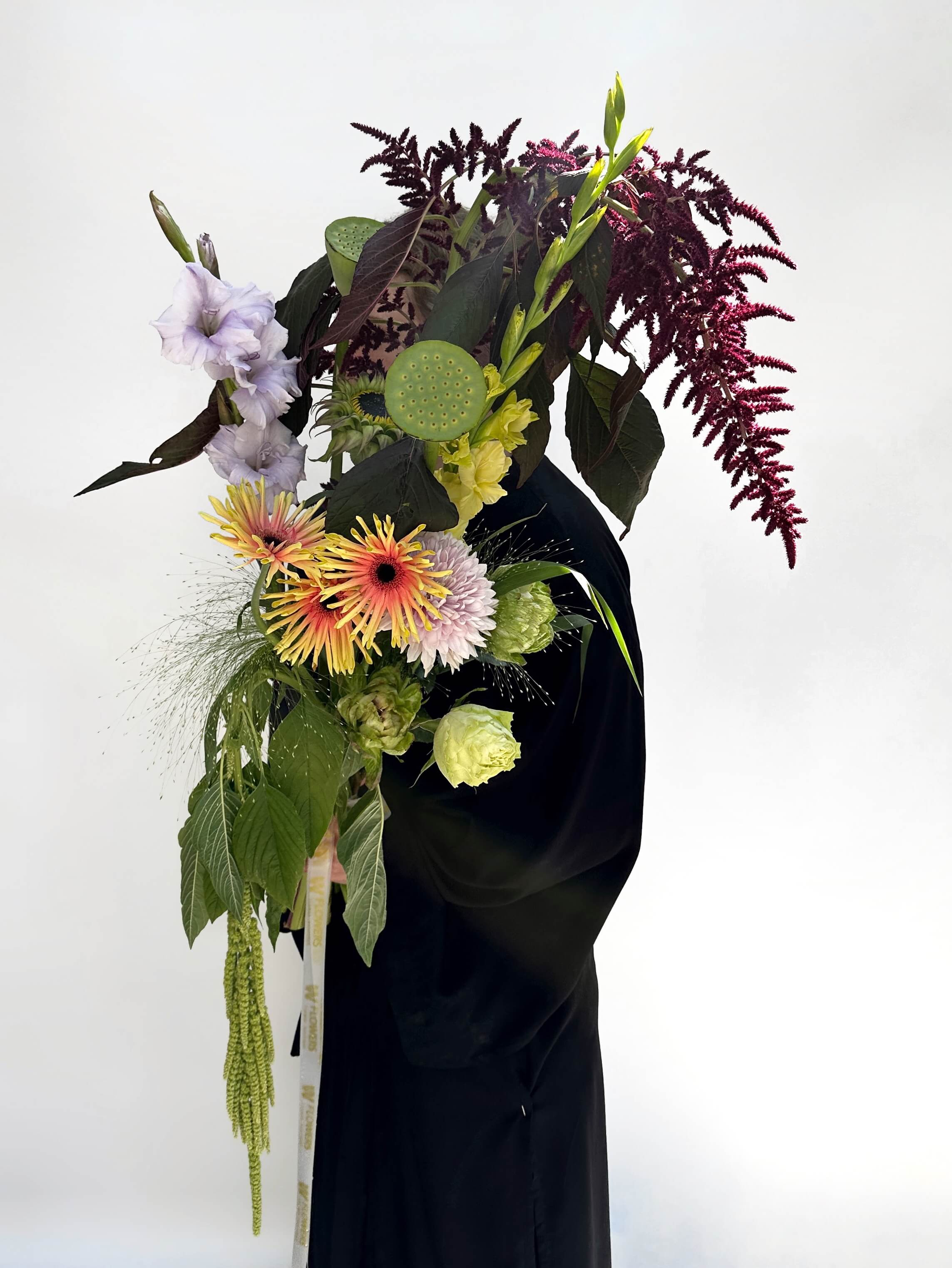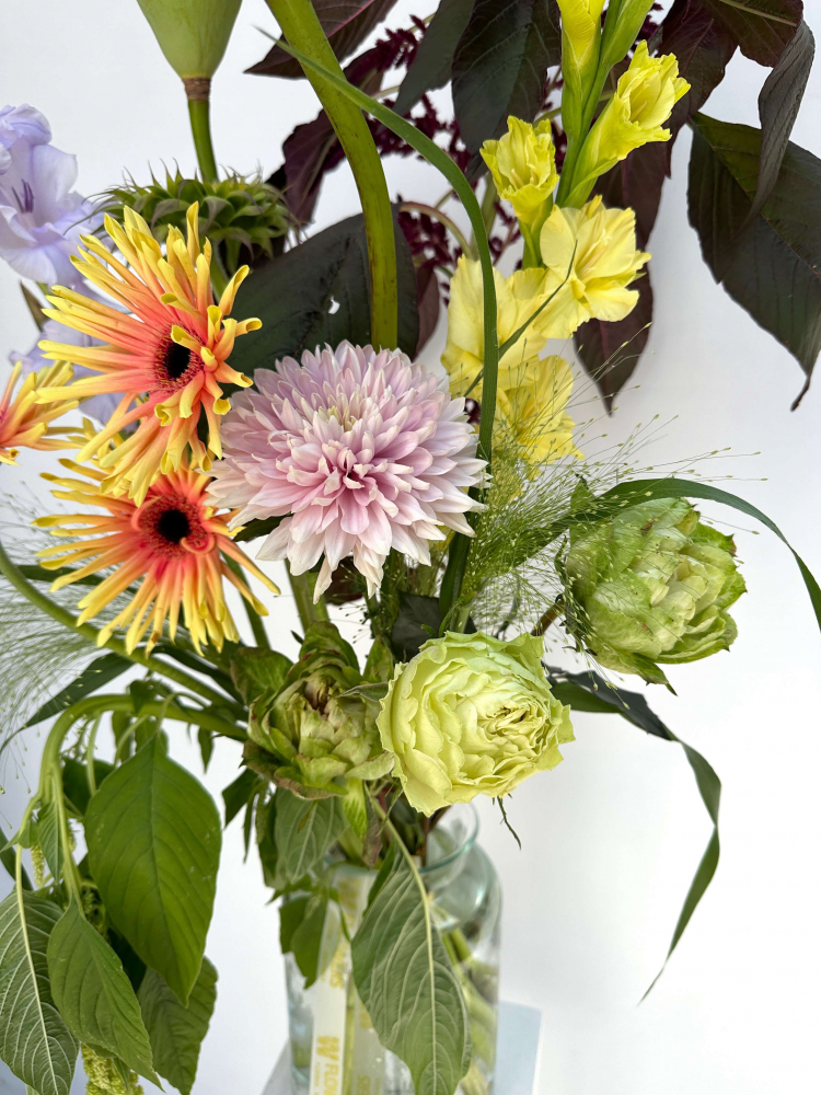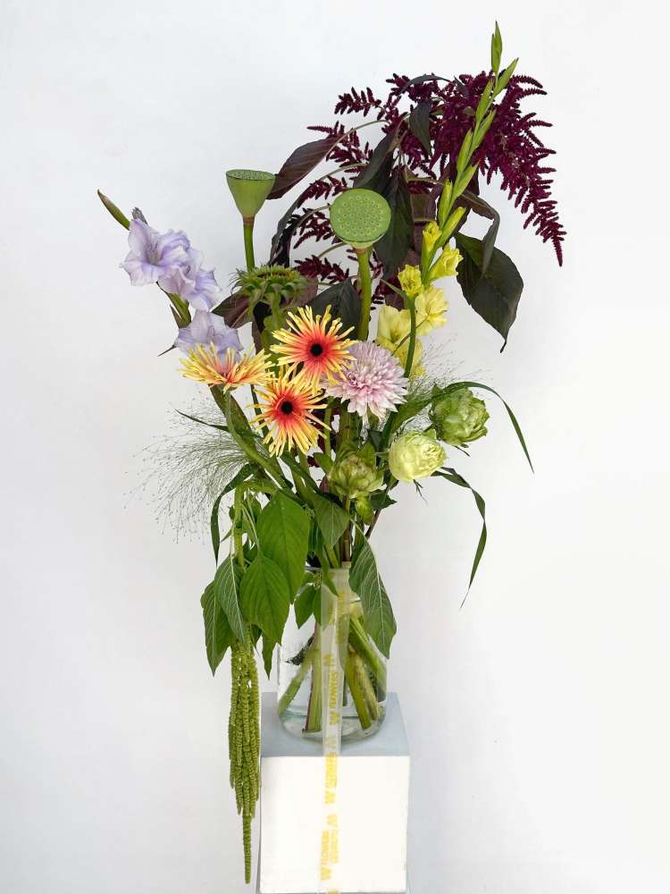 Состав букета на фото: роза вегги, роза лимонад, хризантема одноголовая романцеро, гербера ребел тифун, лотос зеленый (нелюмбо), гладиолус милка сиреневый, гелиантус санфилл пепл / подсолнух, паникум, амарантус