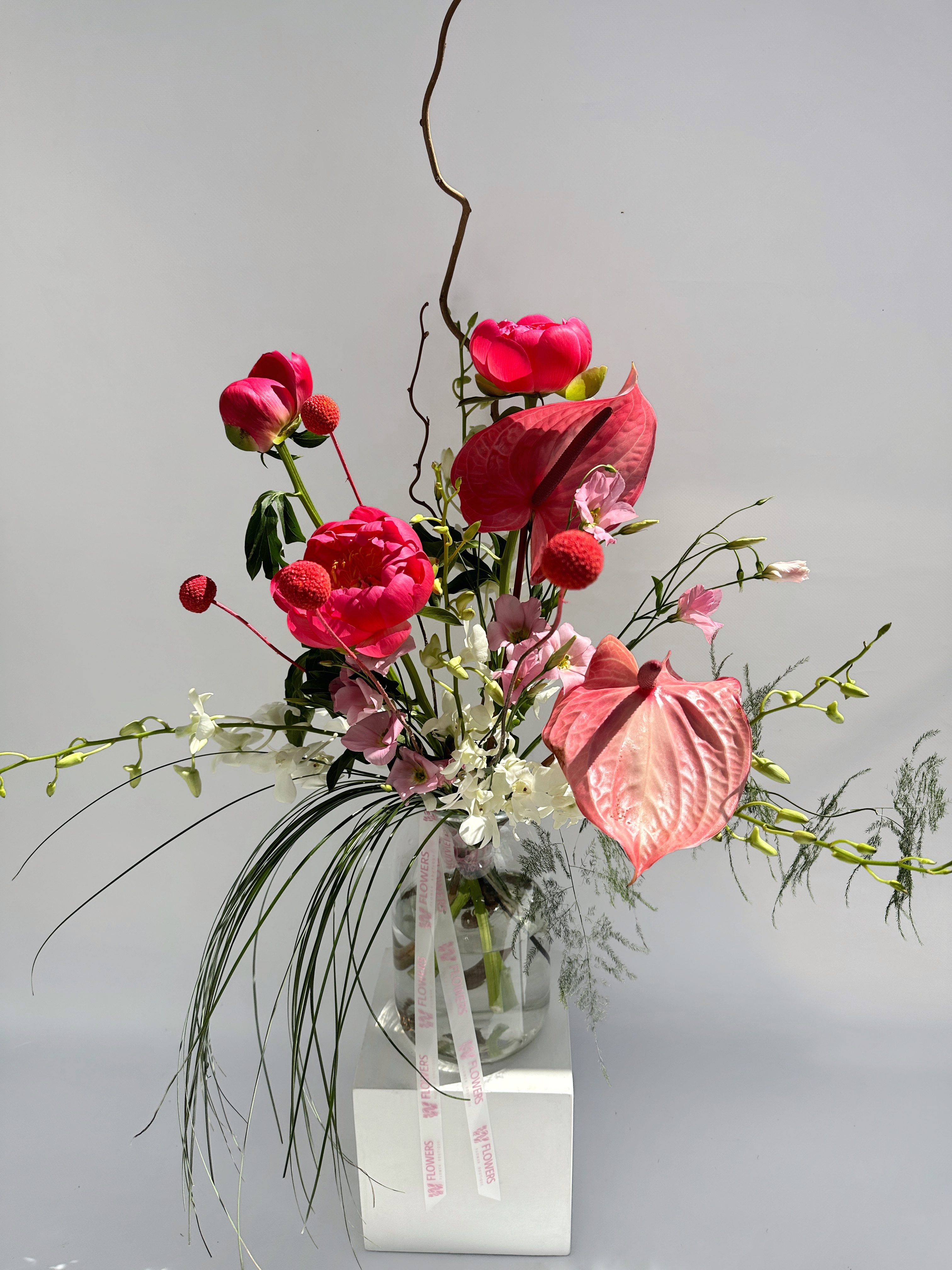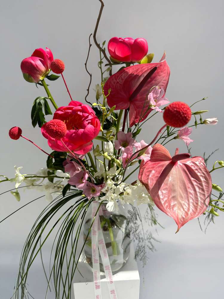 Букет с дендробиумом, пионами и антуриумом окутывает своими ароматами и захватывает взгляды яркостью своих цветов. Идеально подойдет для романтического свидания или в подарок на день рождения, а также станет прекрасным украшением интерьера