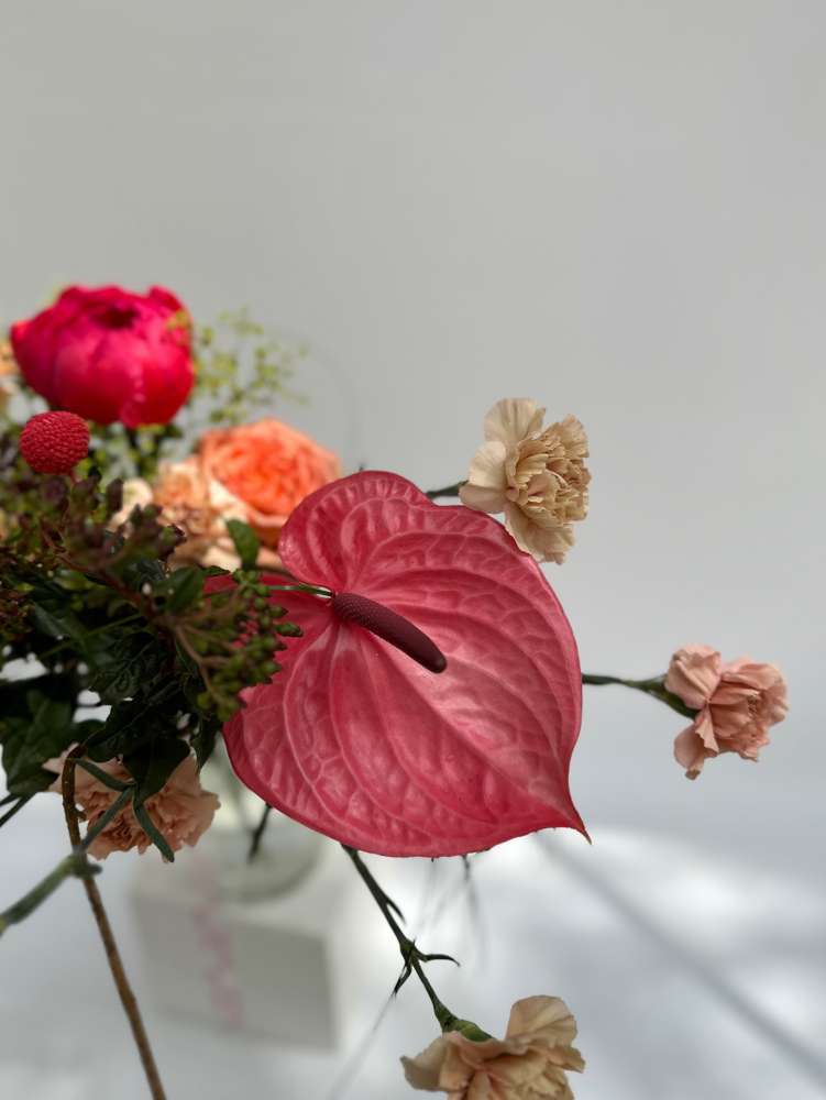 Состав букета на фото: Роза элит флауэр, Вибурнум тинус ред, Диантус/гвоздика, Корилус конторта, Листья берграсс, альхемилла моллис робустика, антуриум Кэнди, краспедия, пион Корал Сансет