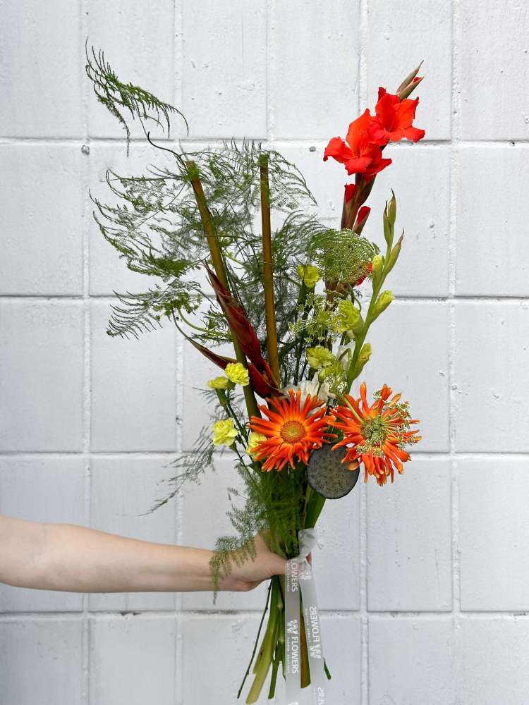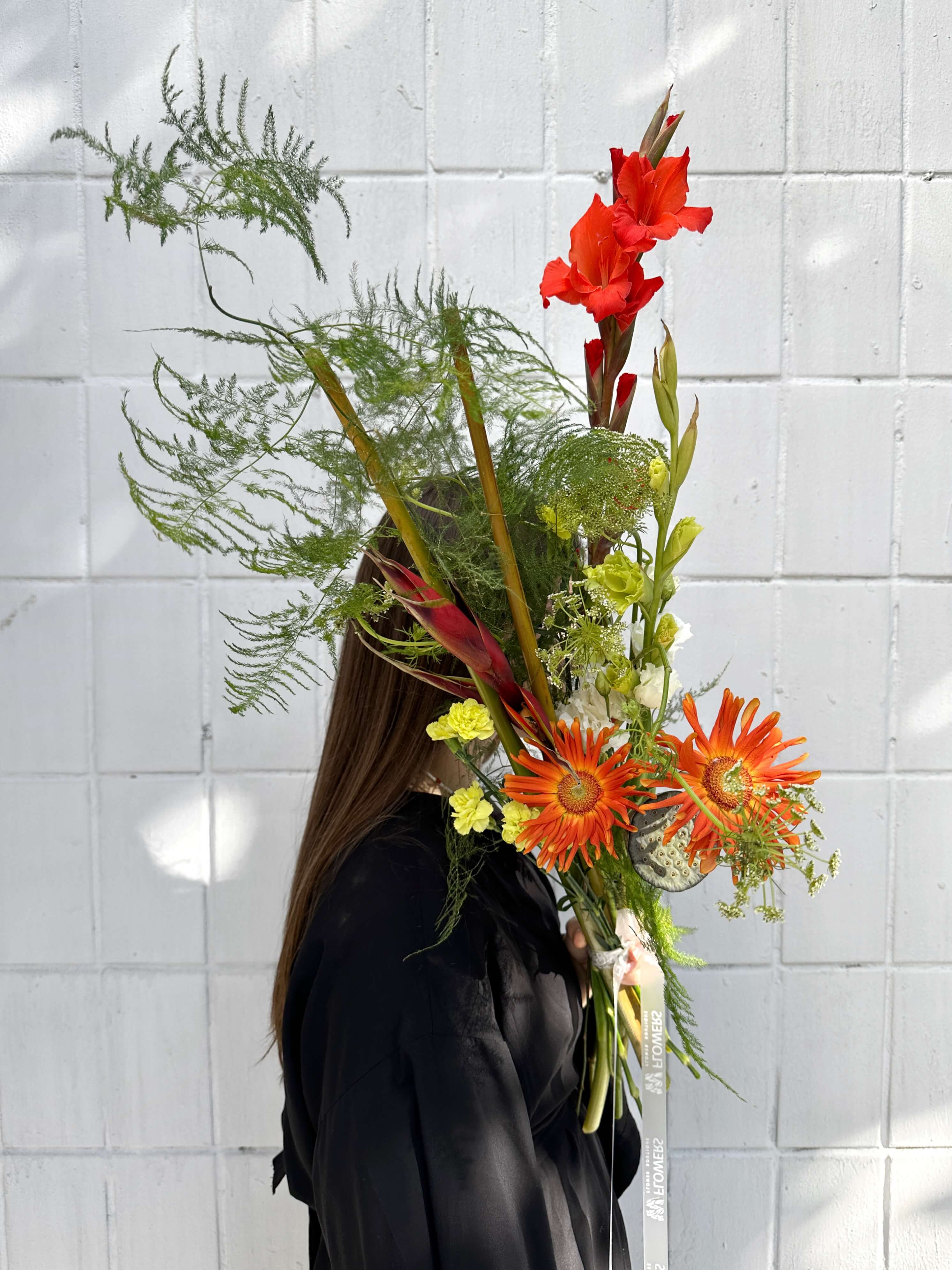Диаметр букета - 85 см, высота - 30 см. Состав букета на фото: Геликония, Гладиолус кио, Гладиолусы, Гербера паста маринара, Лизиантус, Лотос зеленый (нелюмбо), Диантус кустовой / кустовая гвоздика, Амми полевой, Аспарагус. Состав букета может меняться в зависимости от сезонности цветов. Вне сезона георгины заменяются на одноголовые хризантемы