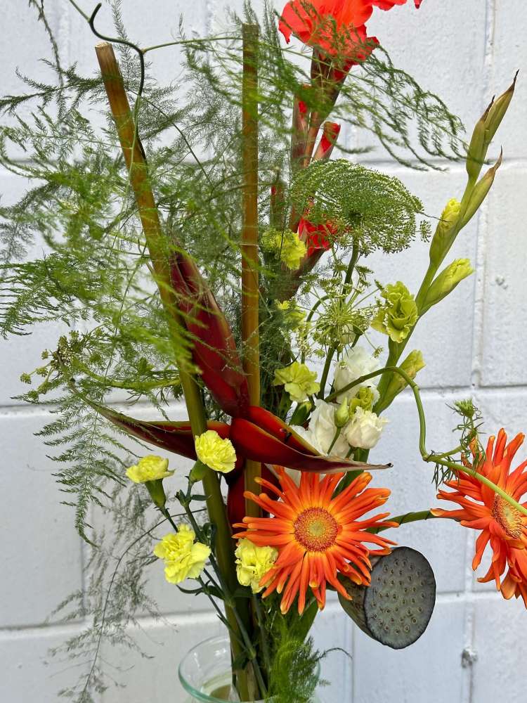 Букет с геликонией, гладиолусами и аспарагусом