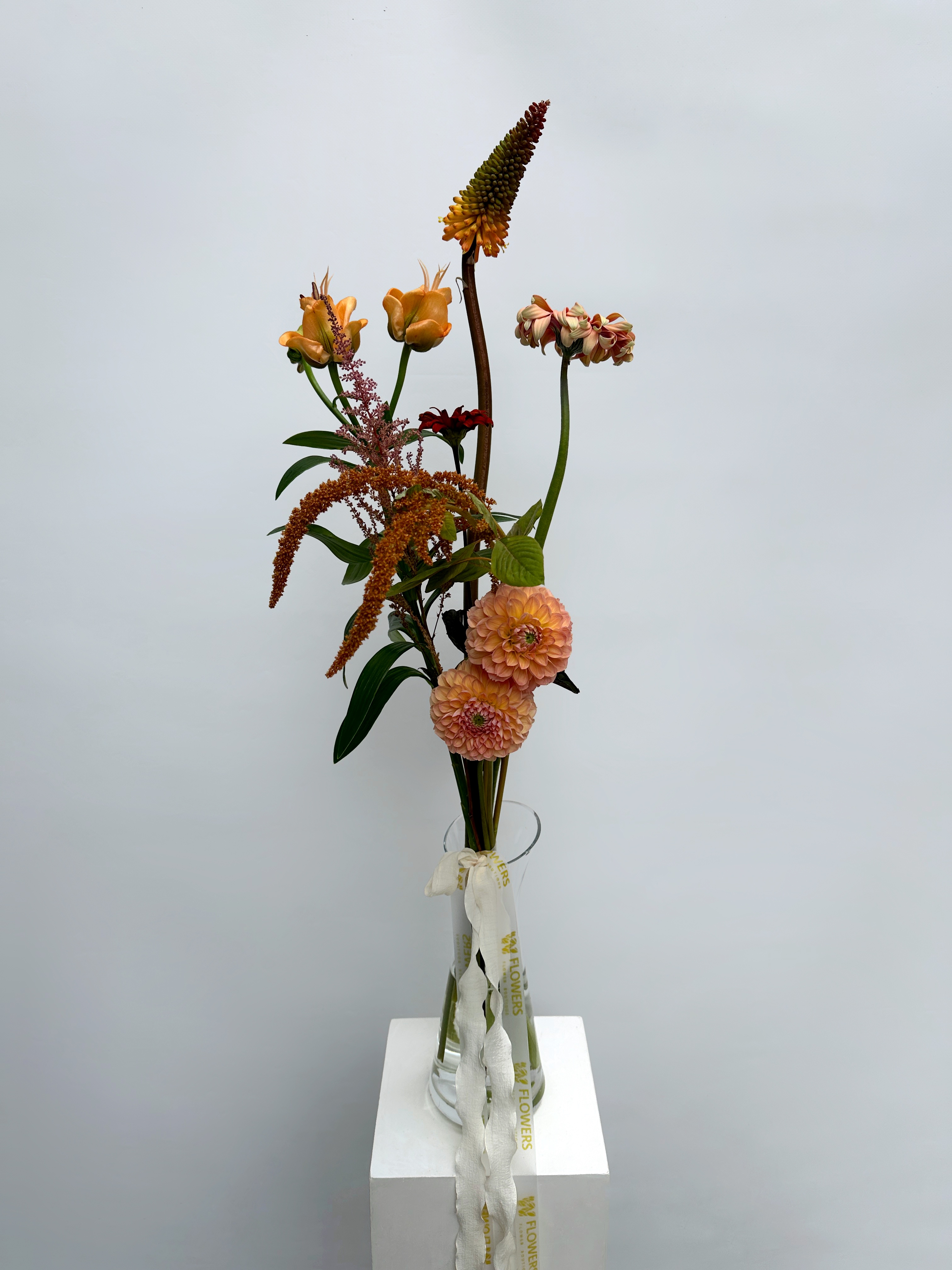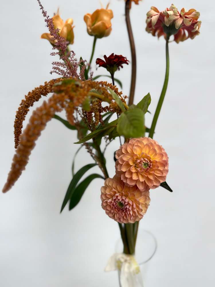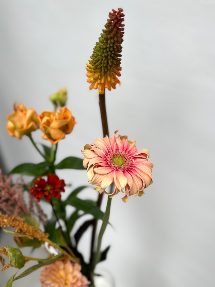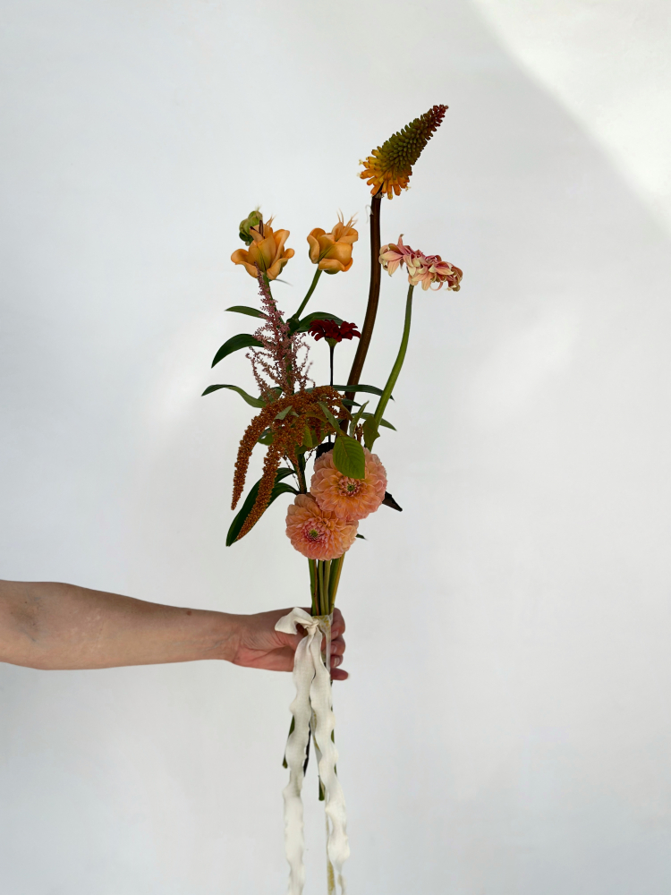 Состав букета на фото: Георгина линдас беби, Книфофия Алказар, Гербера паста росата, Лилия ла эприкот, Астильба, Амарантус хот бискуит, Гелиопсис рэд шейдс. Состав букета может меняться в зависимости от сезонности цветов.