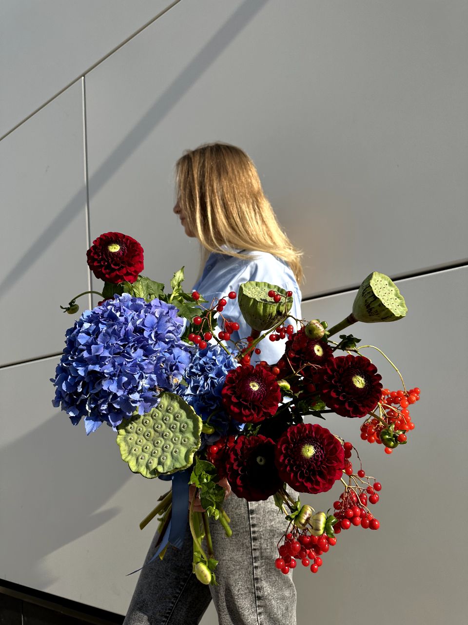 Букет из гортензий, георгин и калины. Насыщенный необычный букет, который запомнится надолго. Идеально подойдет в подарок любимой девушке, на день рождения, день Святого Валентина или на 8 марта.