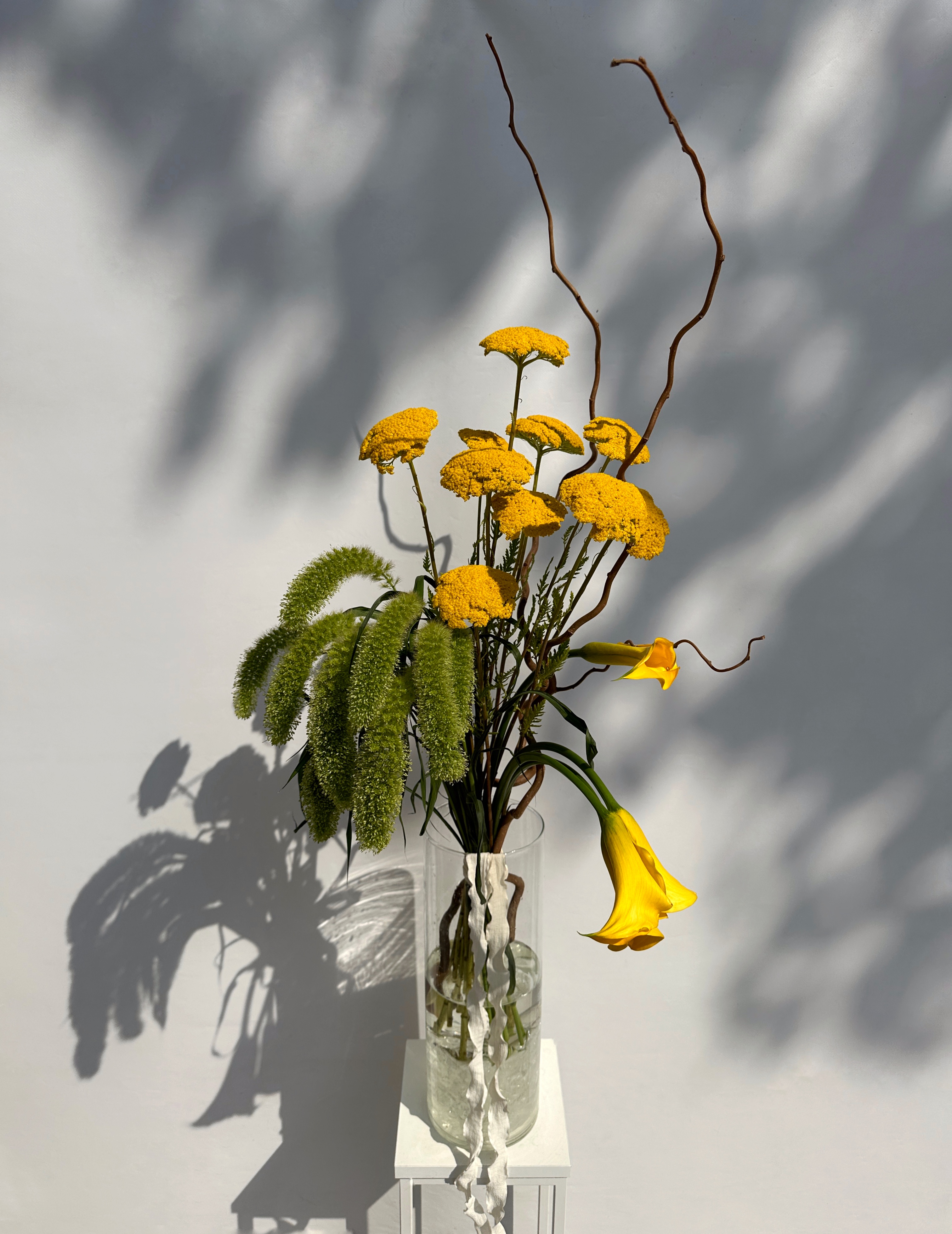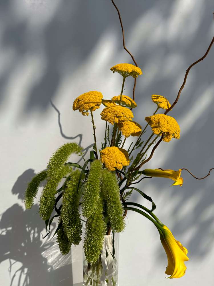 Букет с каллами, сетарией и ахилеей - солнечный витаминный заряд ждет вас в этом ярком букете.