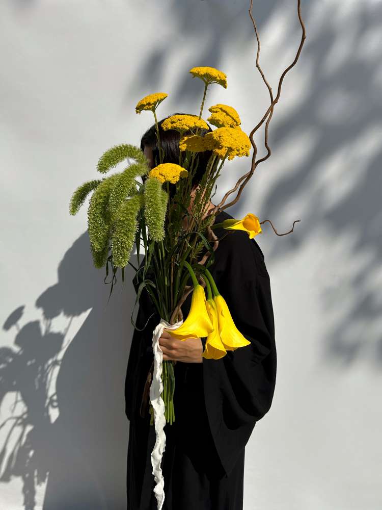 Состав букета на фото: Калла голд медал, Сетария Волл Мелк, Ахилея парк вариети бьюти, Корилус конторта. Состав букета может меняться в зависимости от сезонности цветов.