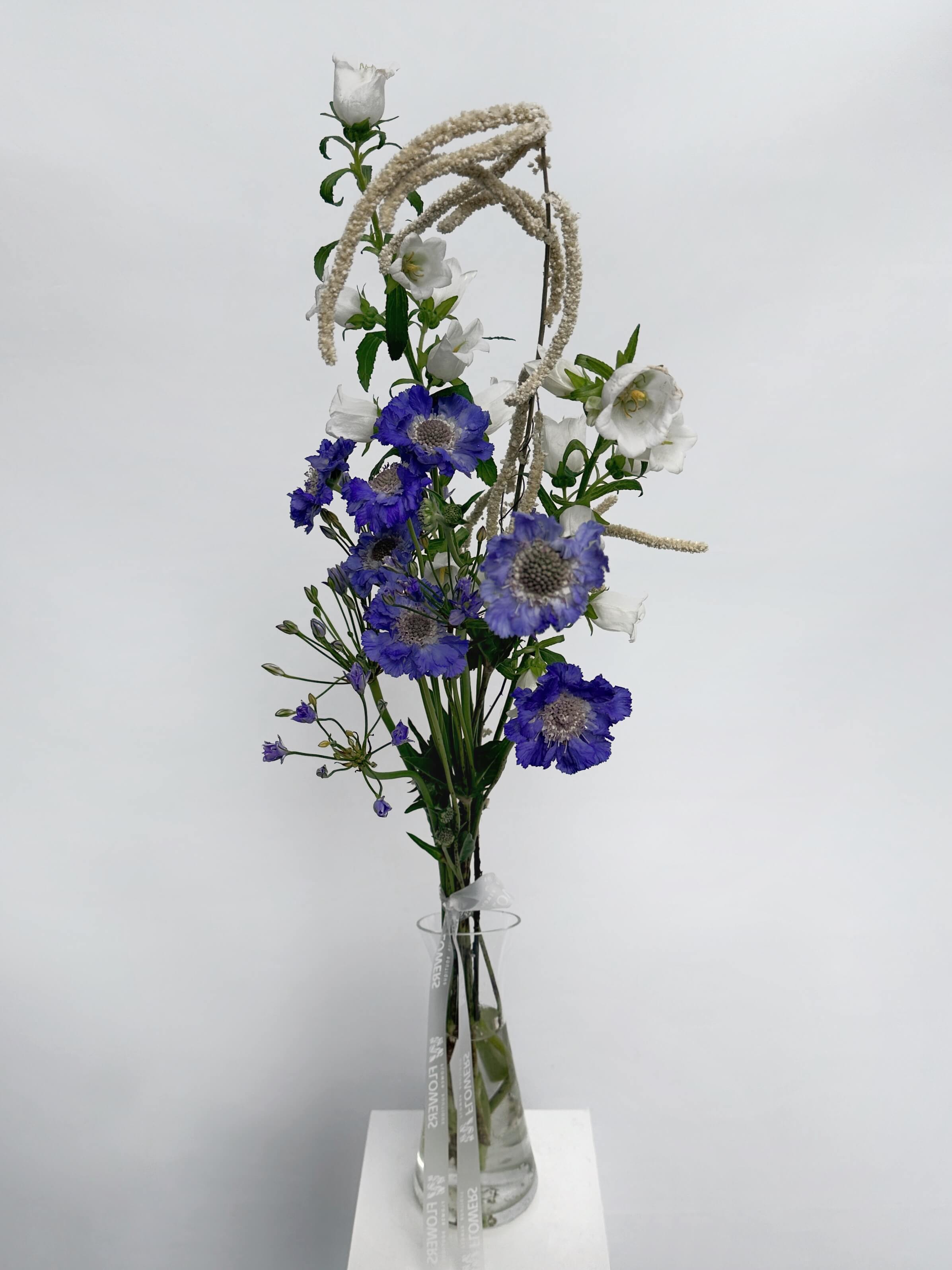Состав букета на фото: Амарантус Ярминг Десерт, Кампанула белая, Трителейя твин систерс, Скабиоза стэфа. Состав букета может меняться в зависимости от сезонности цветов.