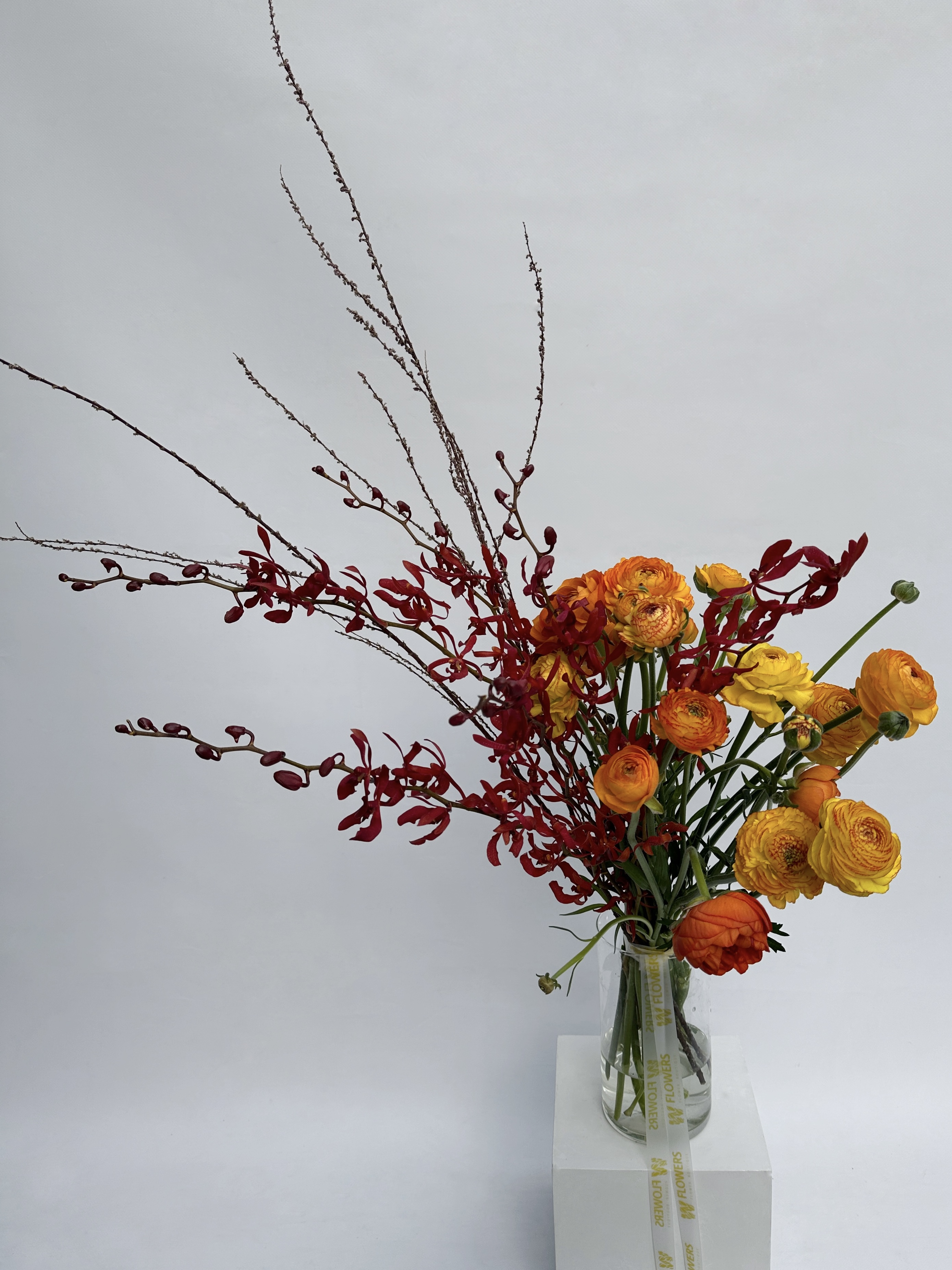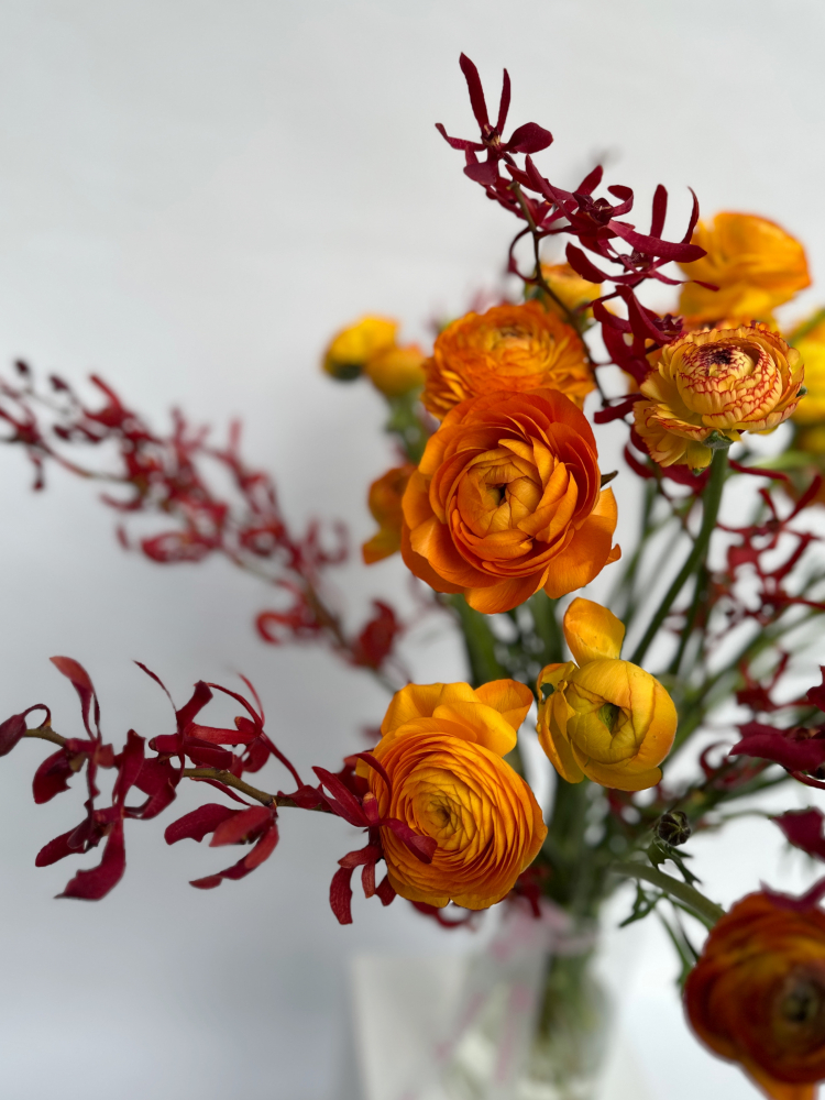 На фото: ранункулюс азур оранжевый, тамариск, арантера красная