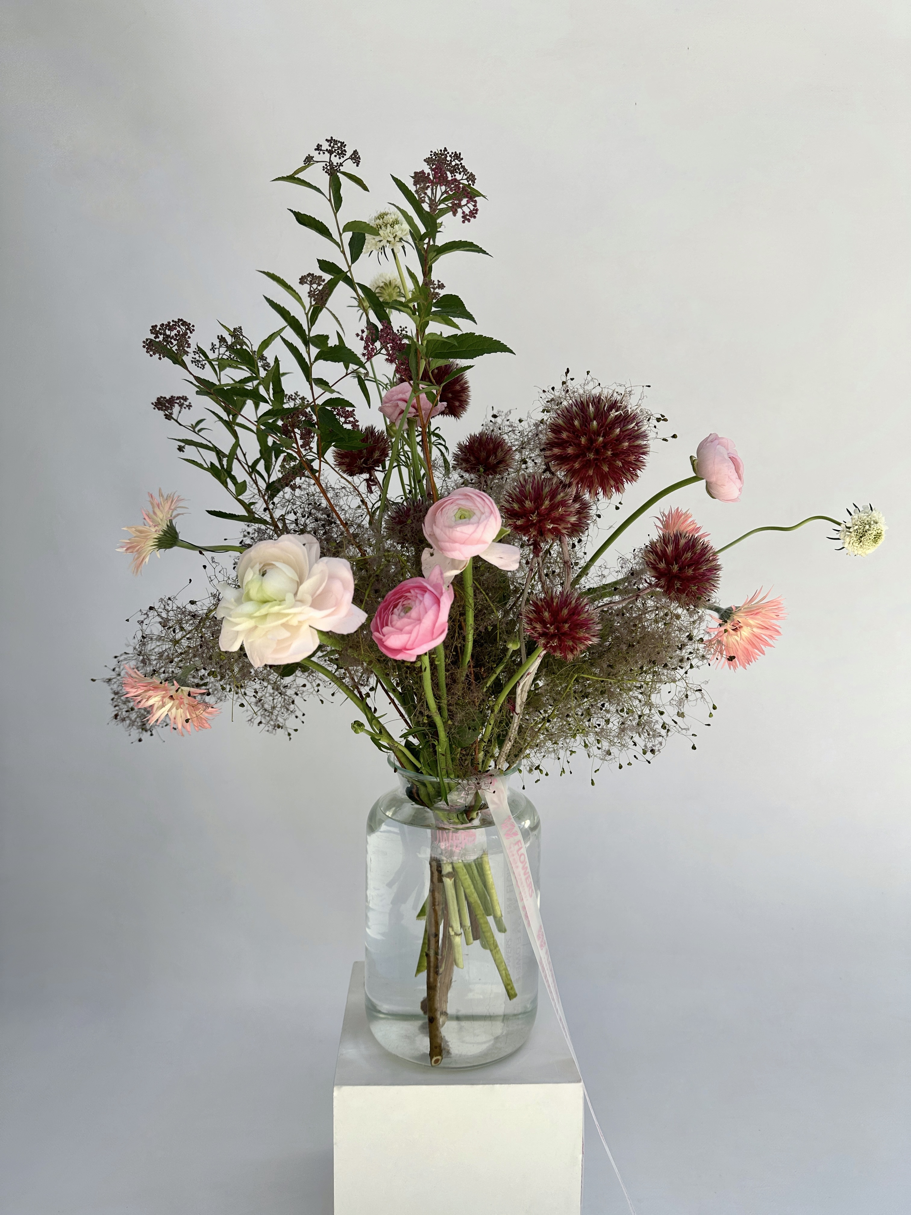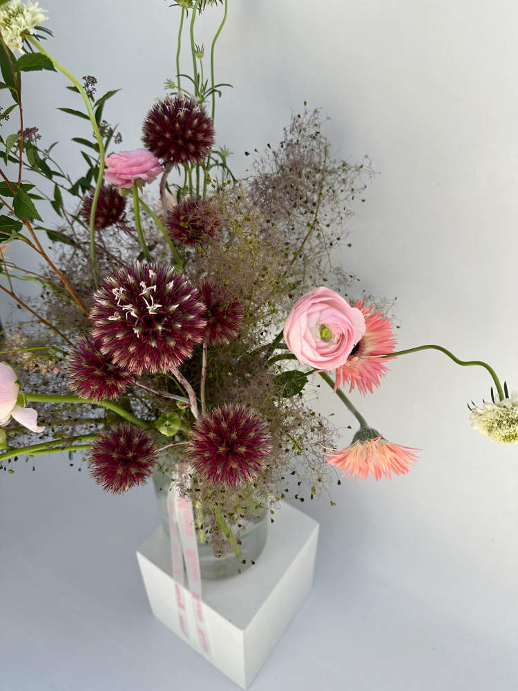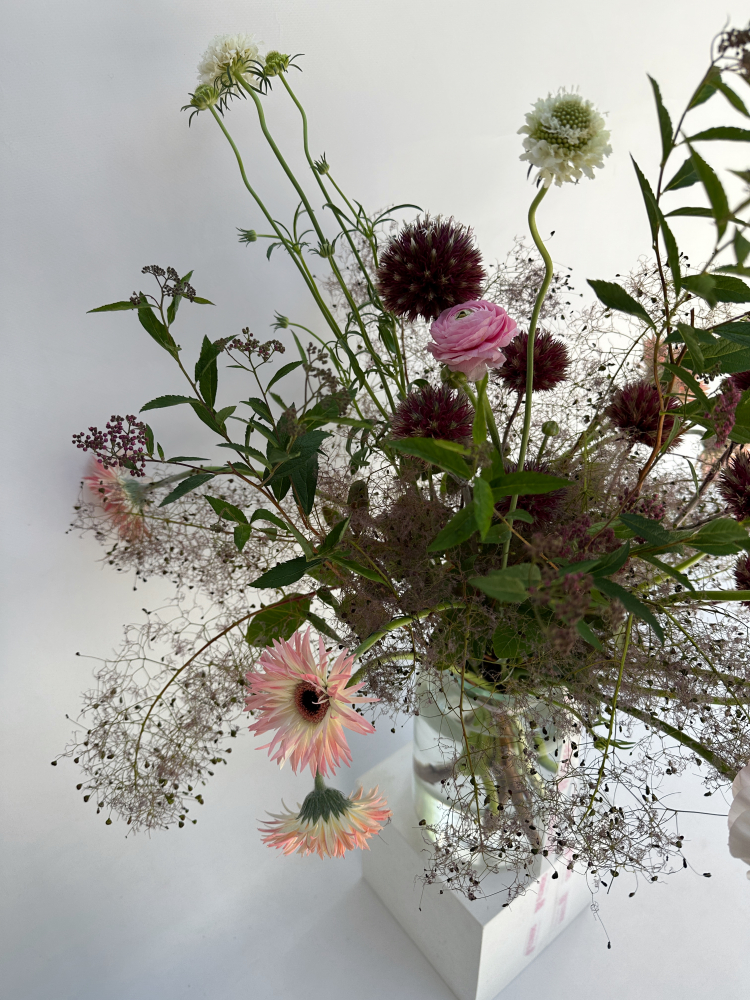 Состав букета на фото: Эрингиум, Минигербера хаги, Ранункулюс маршмеллоу, Скабиоза, Спирея, Скумпия
