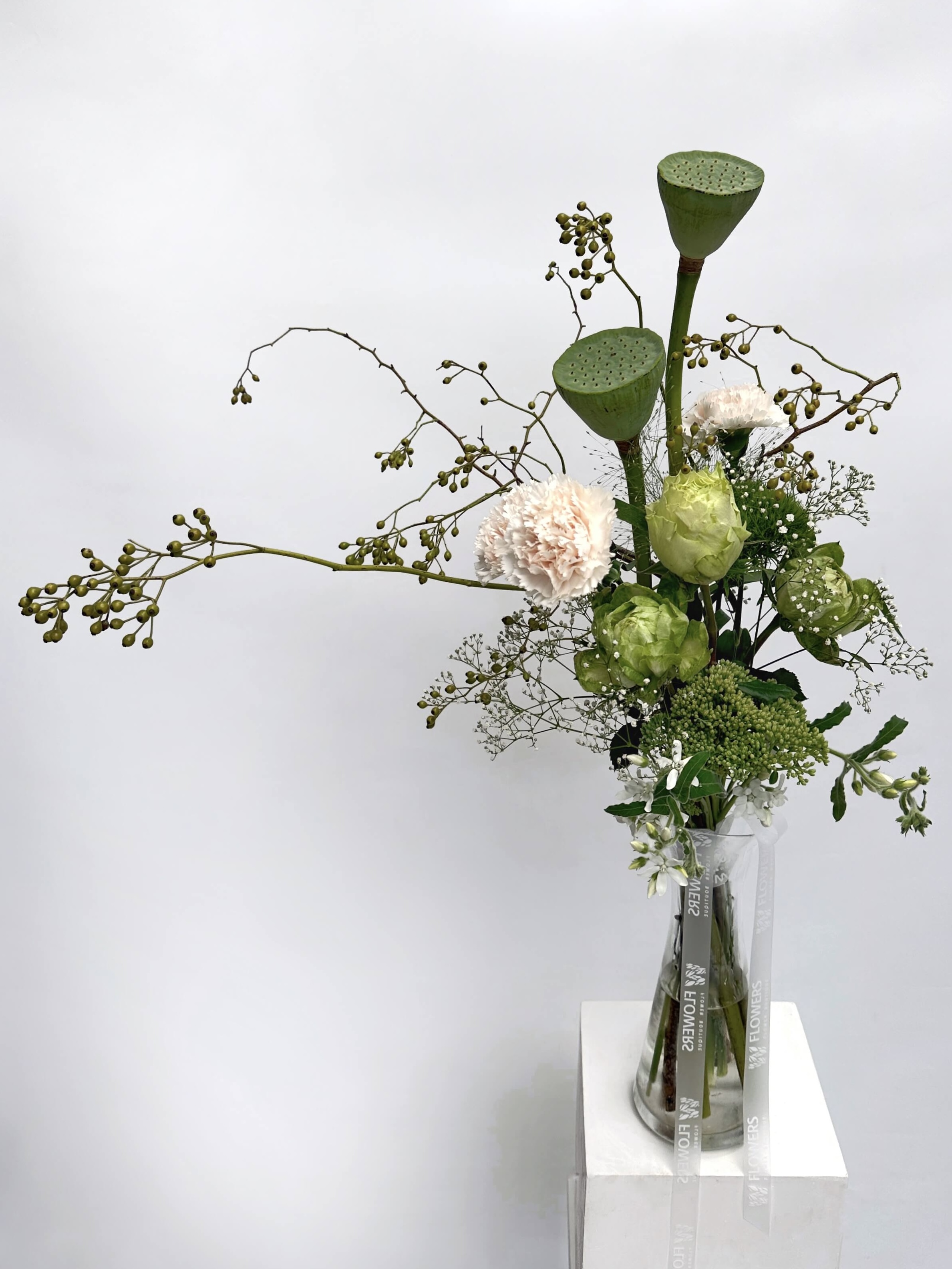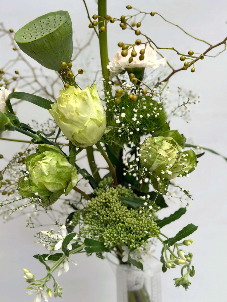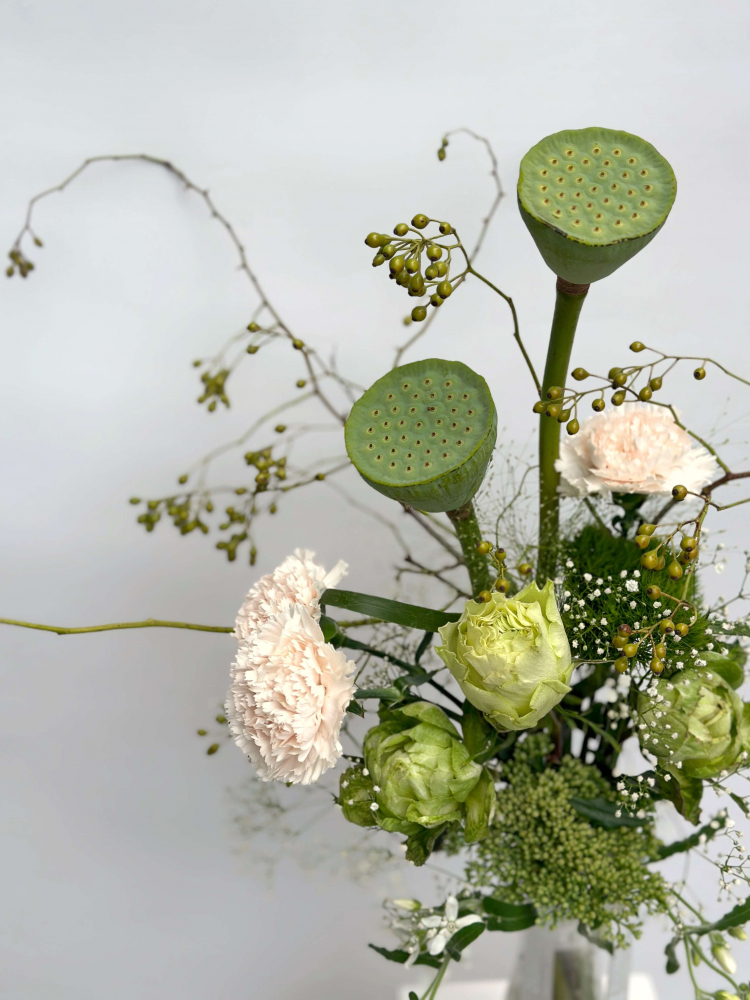 Состав букета на фото: Лотос зеленый (нелюмбо), Диантус / гвоздика, Роза вегги, Гипсофила, Шиповник зеленый, Седум, Гвоздика грин болл, Паникум, Оксипеталум белый. Состав букета может меняться в зависимости от сезонности цветов.