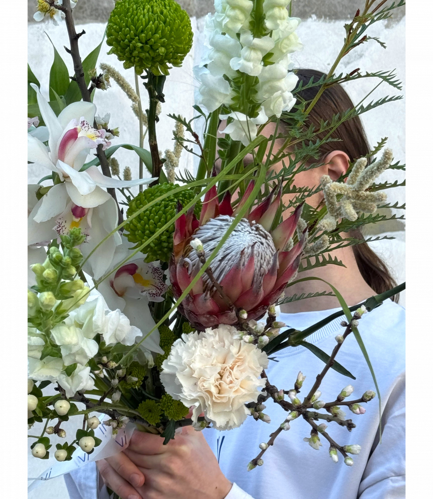 Состав букета: антирринум, фритиллярия, хризантема, гривиллея, гиперикум, цимбидиум, протея, ветки алычи, лизиантус, диантус, листья берграсс, каллы, сантини.
