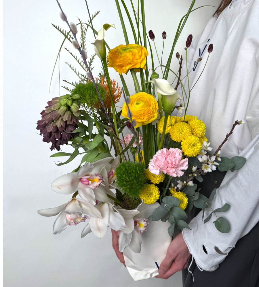 Состав букета: нутан, ранункулюс, хризантема желтая, диантус, гвоздика барбатус, калла, цимбидиум, гривиллея, фритиллярия, верба.